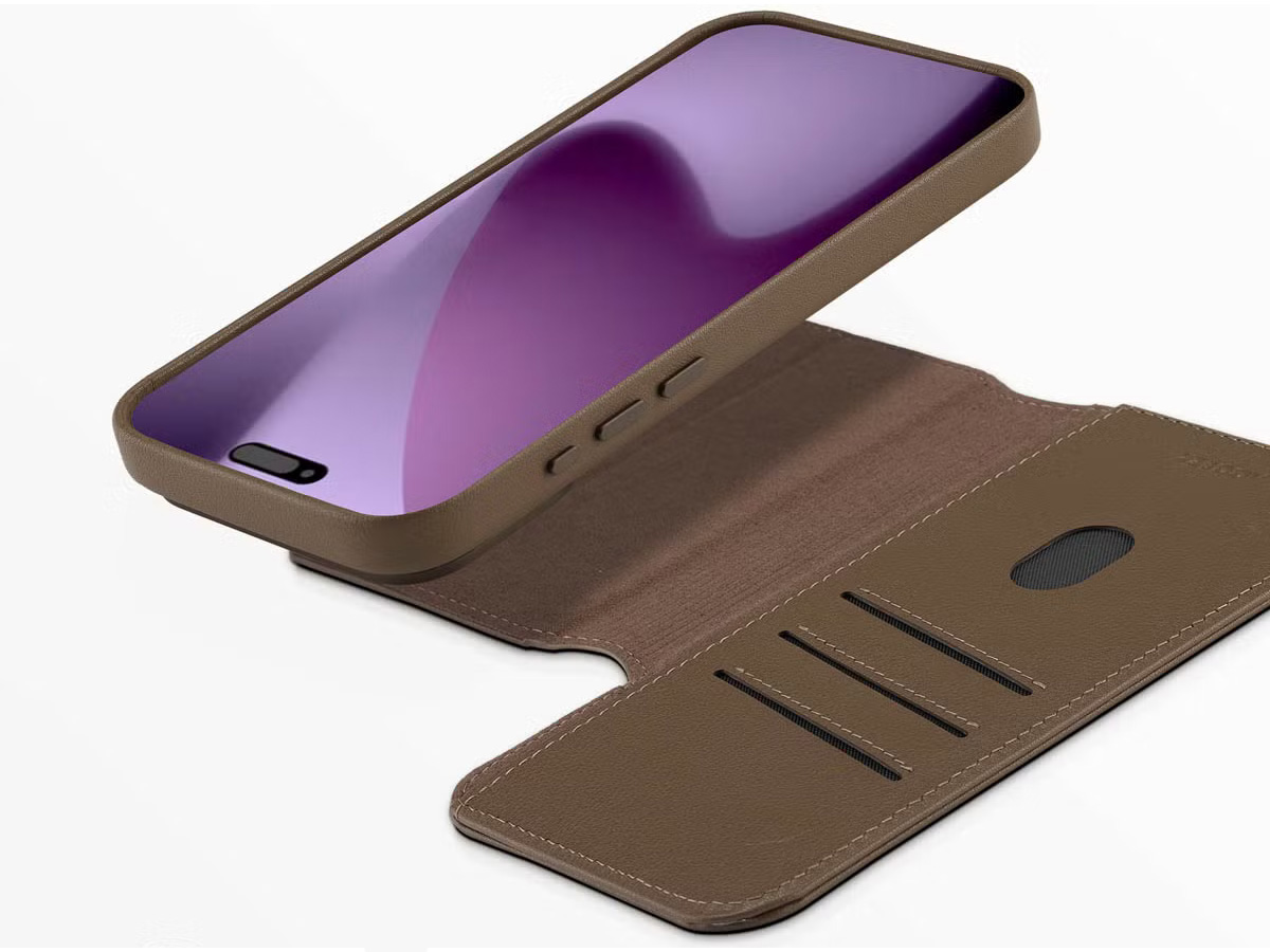 Het leer dat voor deze iPhone 17 case gebruikt is, heeft een minimale leernerf en krijgt daardoor een strakke, moderne uitstraling. De wallet omslag is rondom doorgestikt terwijl de case die om uw toestel klikt volledig tot binnenin bekleed is met leer.