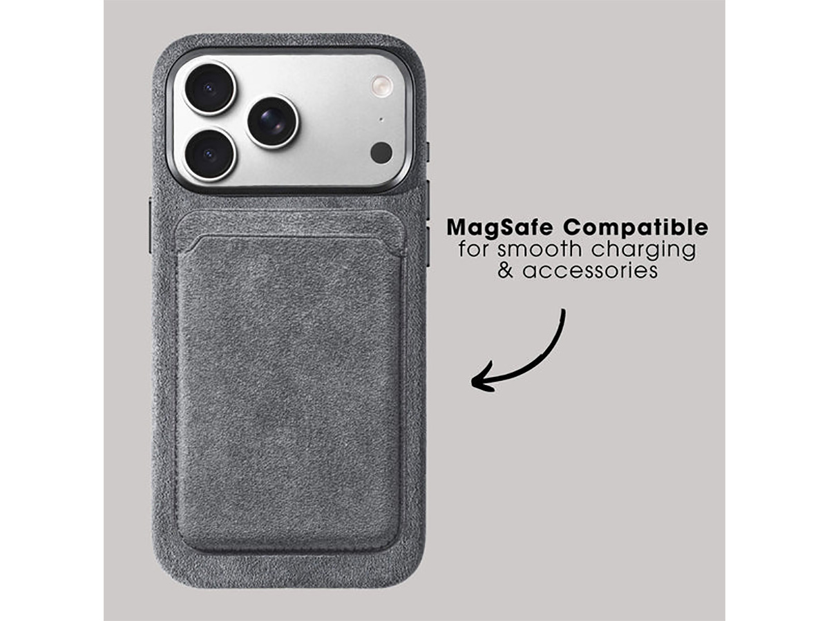 Deze Alcantara iPhone 17 Pro case is volledig compatible met Apple MagSafe. In de achterzijde van de hoes is een magnetische ring verwerkt die perfect met MagSafe opladers en andere MagSafe accessoires werkt, zoals houders, wallets en stands.