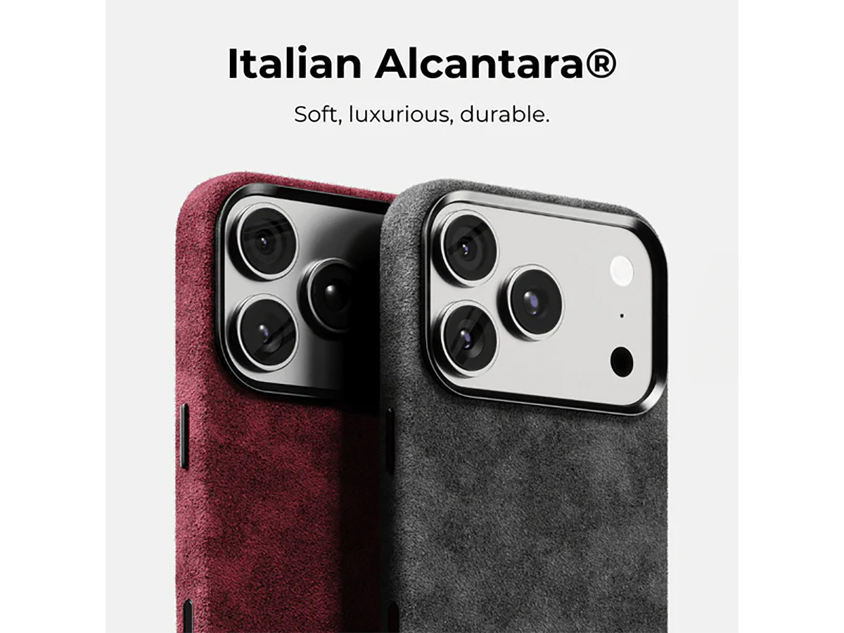Deze luxe Alcanside Full Alcantara iPhone 17 Pro Max case volledig gemaakt van écht Italiaans Alcantara. Het iPhone 17 Pro Max hoesje heeft hierdoor een luxe en tegelijk sportieve uitstraling.