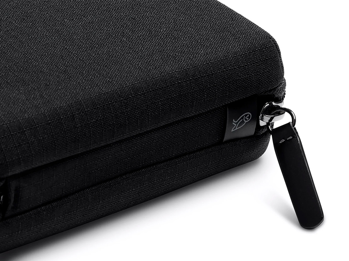 Binnenin zorgen stretch mesh vakken en elastische kabelhouders ervoor dat accessoires hun eigen plek krijgen. Hierdoor blijven kabels, oordopjes en adapters gescheiden van grotere accessoires zoals een oplader of muis, zodat alles overzichtelijk en zonder knopen opgeborgen blijft.