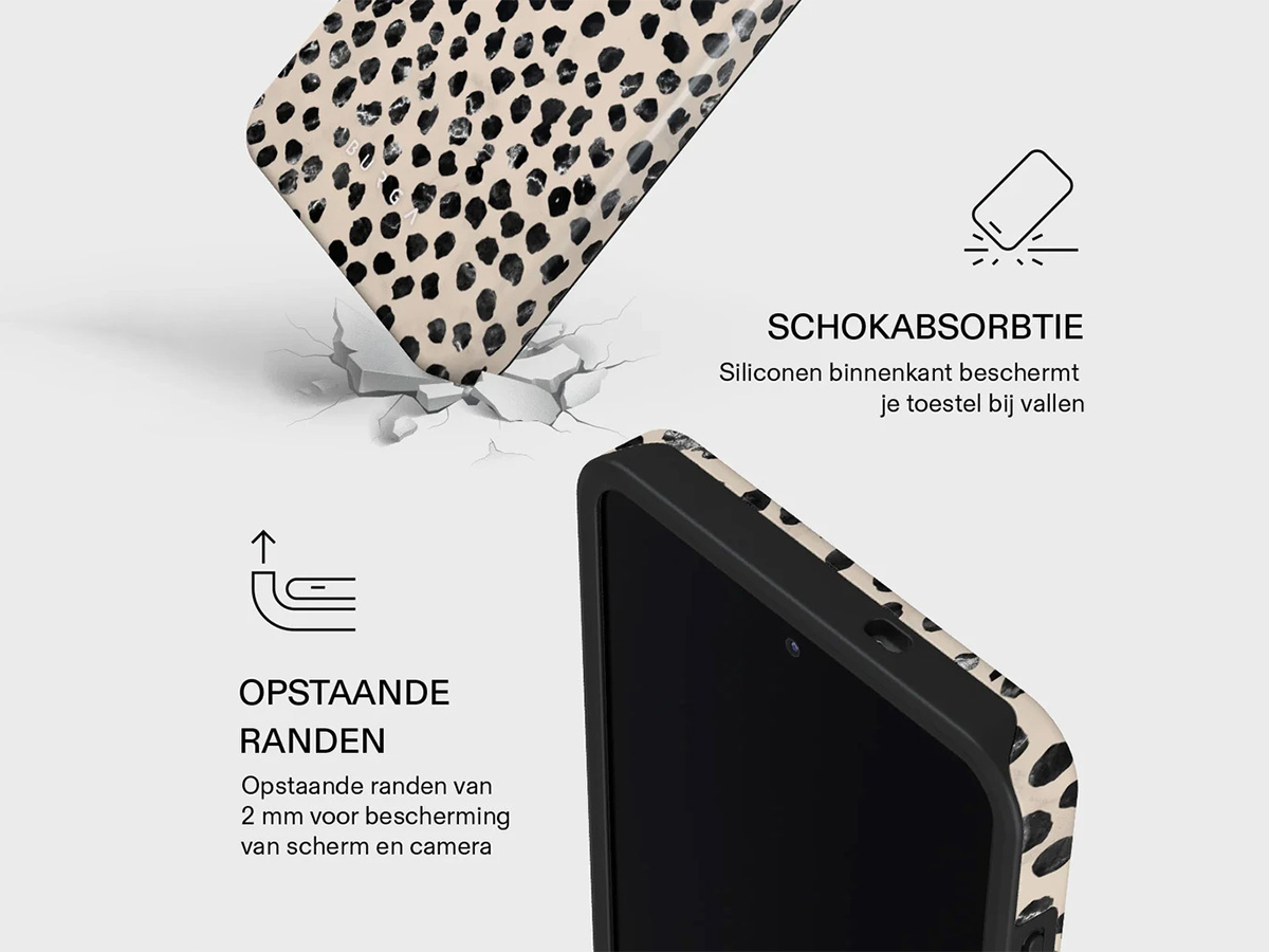 De Burga Tough Case combineert een zachte, schokabsorberende TPU binnenlaag met een harde polycarbonaat buitenlaag. Samen vormen deze twee lagen een duurzame bescherming die je Galaxy S26 veilig houdt tegen vallen, stoten en krassen. Het hoesje blijft daarnaast slank en comfortabel in gebruik.