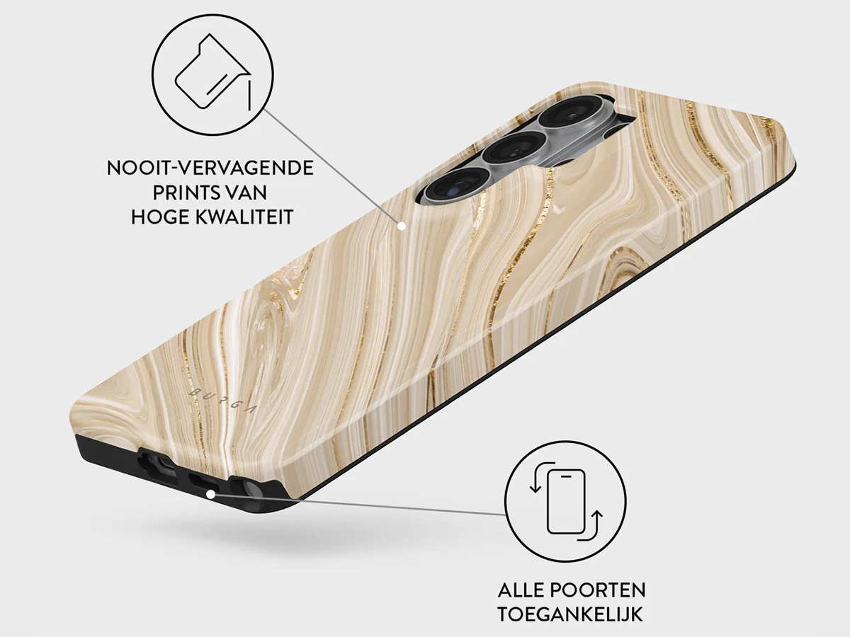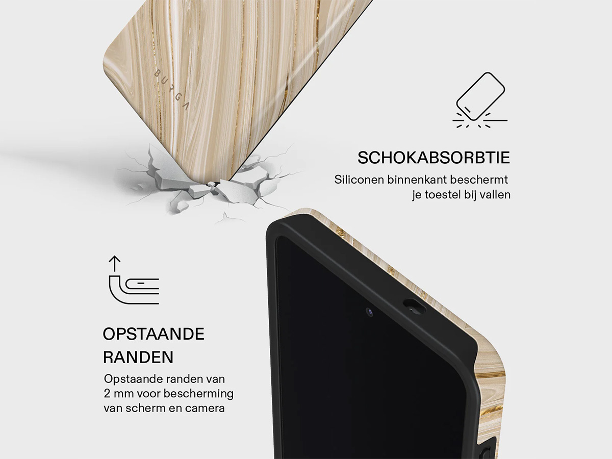 De Burga Tough Case combineert een zachte, schokabsorberende TPU binnenlaag met een harde polycarbonaat buitenlaag. Samen vormen deze twee lagen een duurzame bescherming die je Galaxy S26 Ultra veilig houdt tegen vallen, stoten en krassen. Het hoesje blijft daarnaast slank en comfortabel in gebruik.