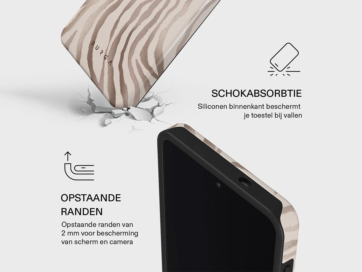 De Burga Tough Case combineert een zachte, schokabsorberende TPU binnenlaag met een harde polycarbonaat buitenlaag. Samen vormen deze twee lagen een duurzame bescherming die je Galaxy S26 Ultra veilig houdt tegen vallen, stoten en krassen. Het hoesje blijft daarnaast slank en comfortabel in gebruik.