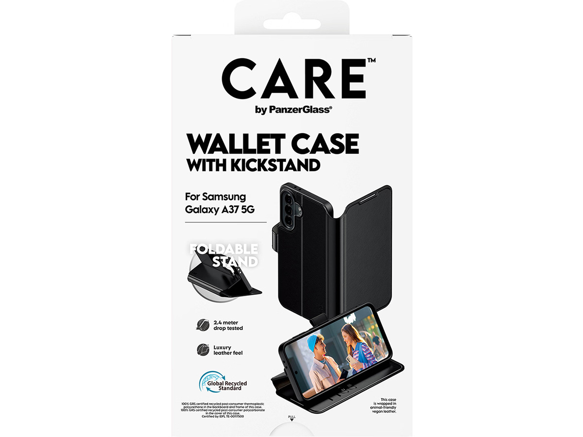 De CARE by PanzerGlass Wallet Case voor de Samsung Galaxy A37 combineert een stijlvolle uitstraling en praktische functionaliteit met een zeer bewuste materiaalkeuze. Dit hoesje onderscheidt zich door het verantwoorde, gecertificeerde materiaalgebruik.