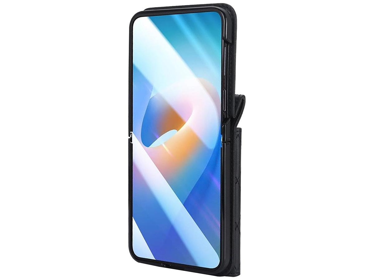 Op de achterzijde van dit Samsung Galaxy Z Flip 6 hoesje vindt u een vakje met een drukknoopsluiting. Binnenin dit vakje zijn er 4 afzonderlijke vakken waarin u pasjes en briefgeld kunt opbergen. Het vakje heeft een RFID werende lining zodat u veilig bent voor skimmers.