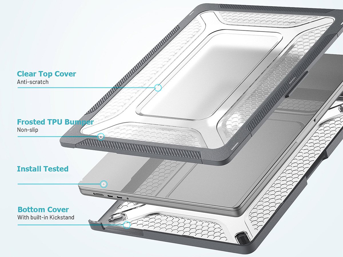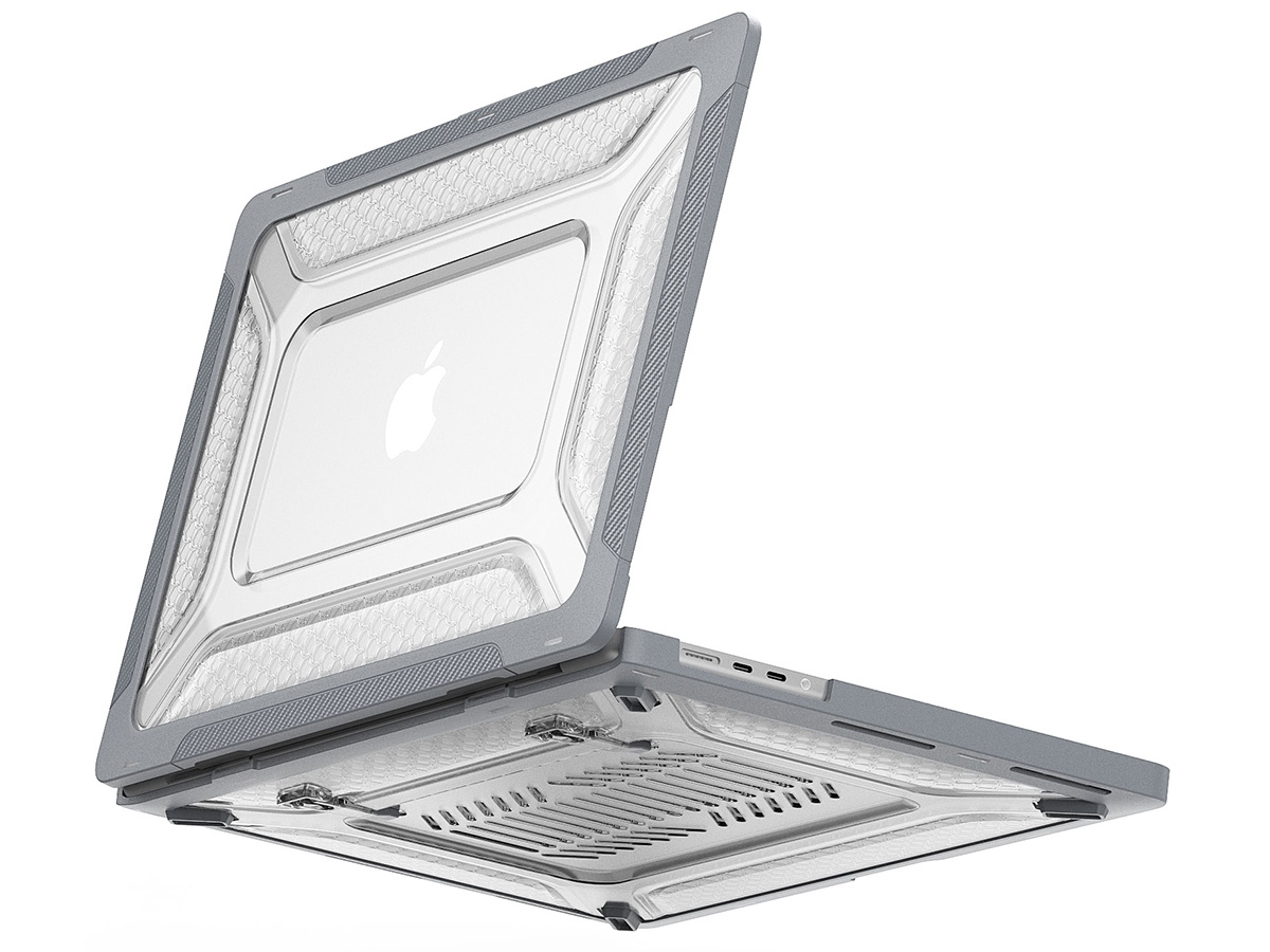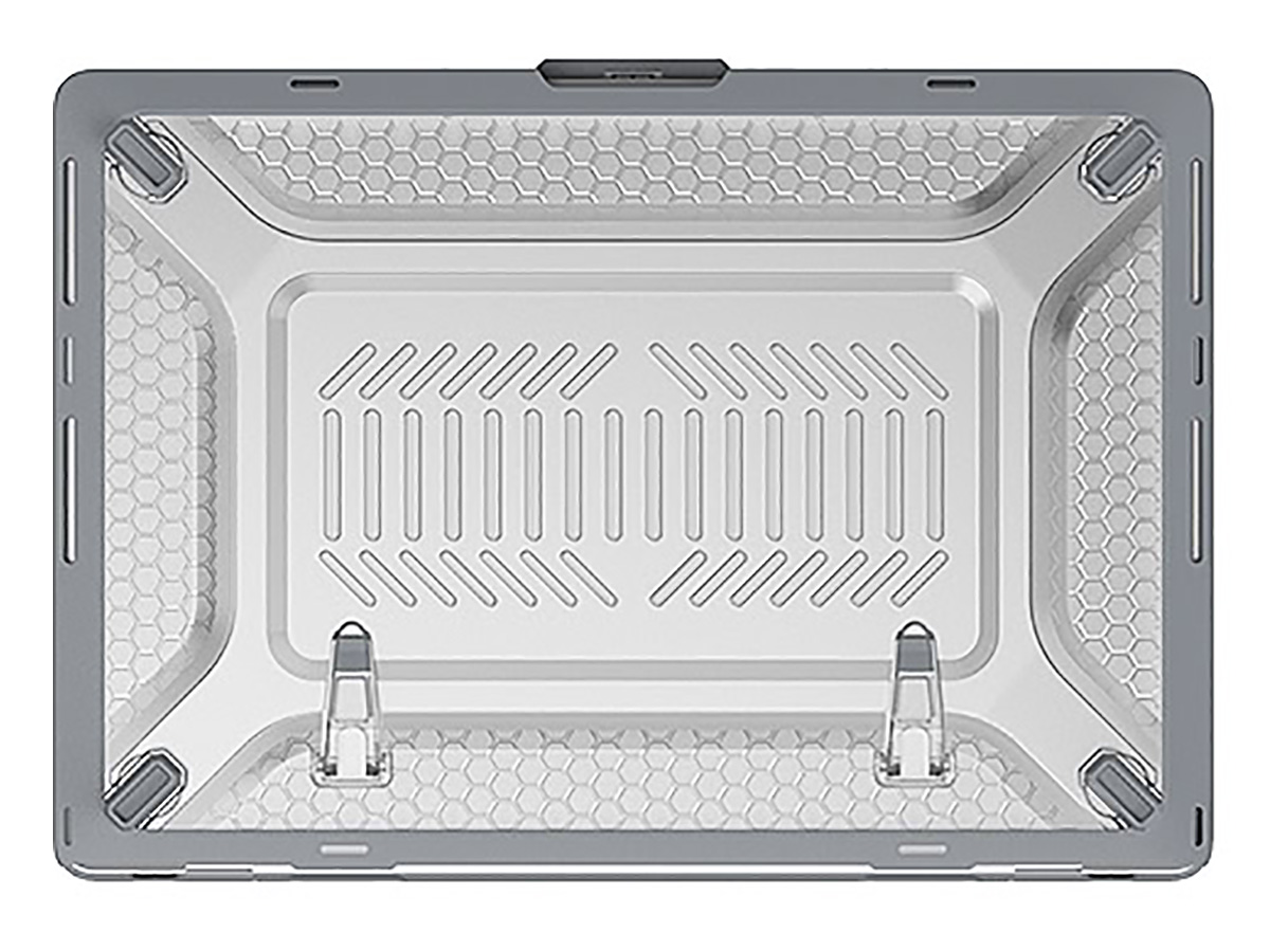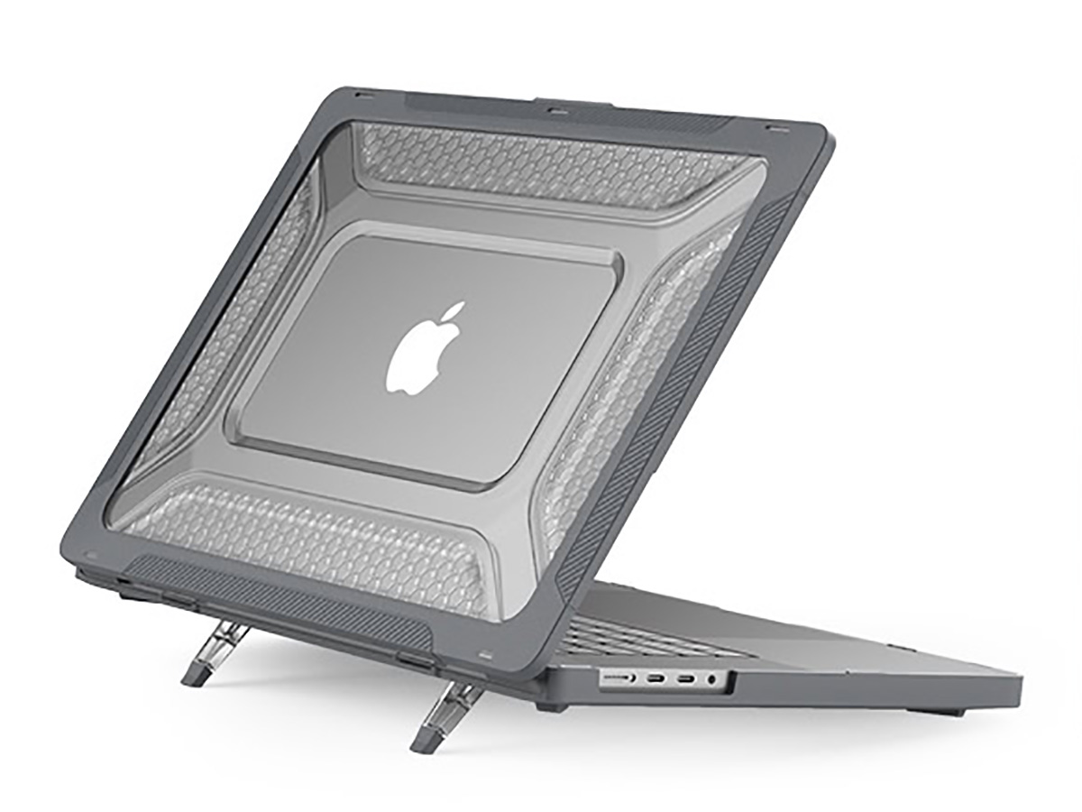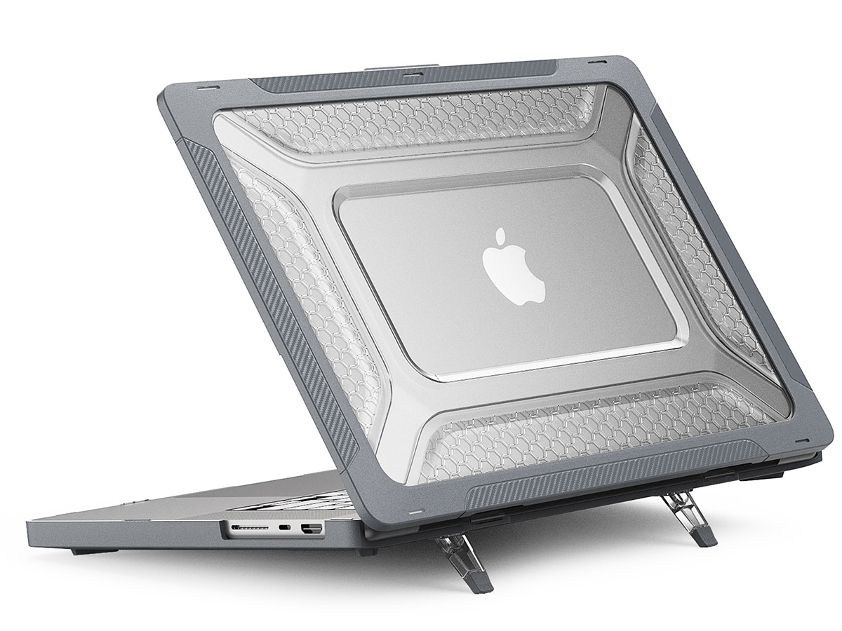 Dit hoesje voor de MacBook Pro 16" is zo ontworpen dat deze de functionaliteit van uw laptop op geen enkele manier hindert. De laptop klapt nog net zo soepel open, hindert de koeling niet dankzij koelsleuven op de onderzijde en heeft uitsnedes zodat alle aansluitingen ongehinderd bereikbaar blijven. De case voegt zelfs functionaliteit toe in de vorm van twee uitklapbare pootjes onderop, waarmee u uw MacBook licht hellend neer kunt zetten. Dit draagt bij aan een ergonomische werkhouding.