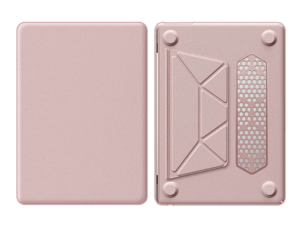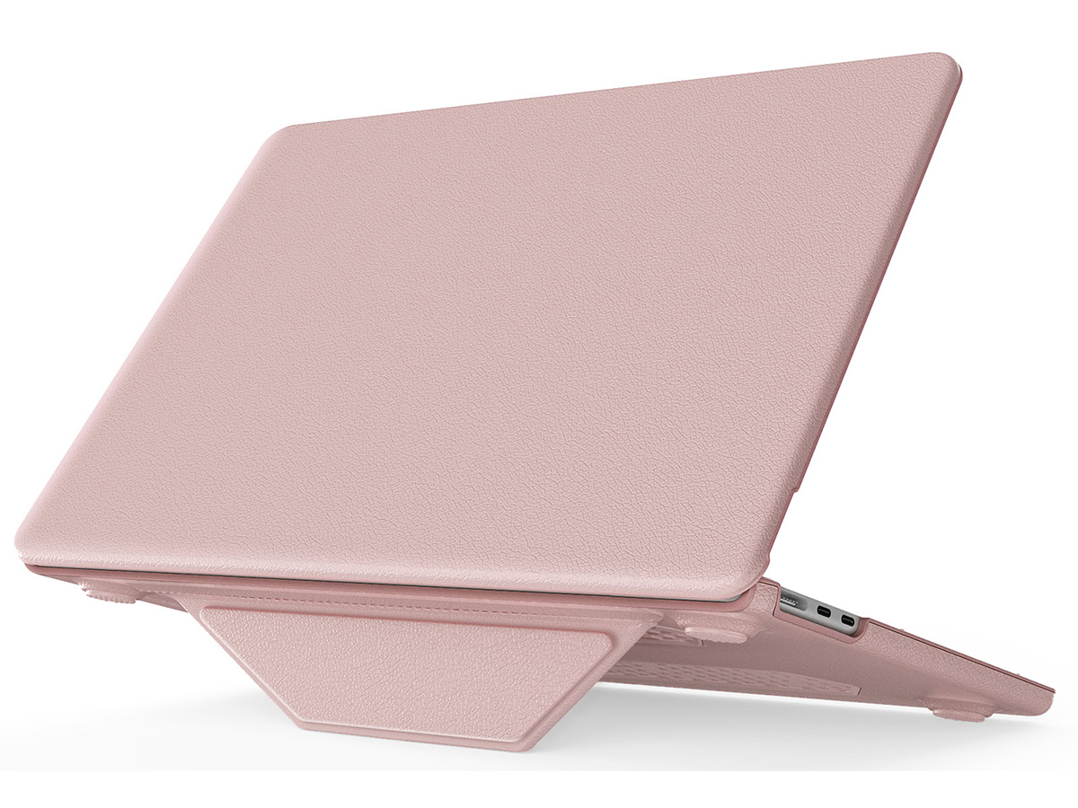 De case voegt zelfs functionaliteit toe in de vorm van een geïntegreerde stand die uw MacBook licht hellend positioneert. Dit draagt bij aan een ergonomische werkhouding doordat u meer rechtop kunt werken. Deze stand zit volledig vlak op de onderzijde van de case en kan indien gewenst in een handomdraai opgevouwen worden.