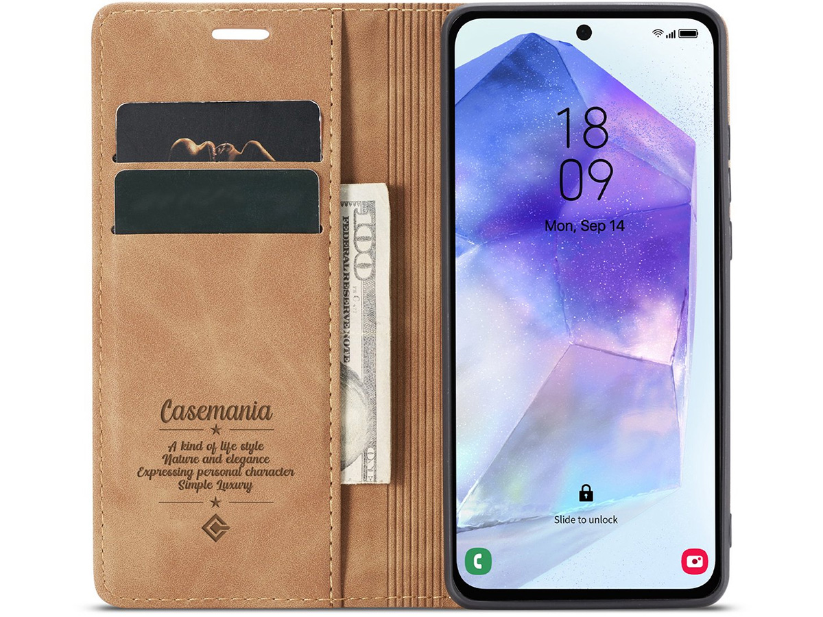 Dit slanke Samsung Galaxy S26+ boek hoesje van CaseMania is uitgevoerd in hoogwaardig kunstleer met een prachtige vintage look die mooi afsteekt tegen de moderne look van het toestel zelf. De case is verkrijgbaar in verschillende fraaie kleuren.
