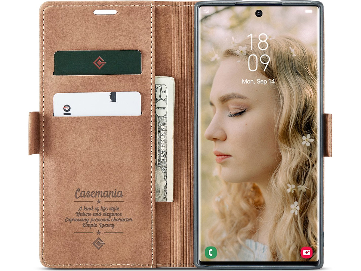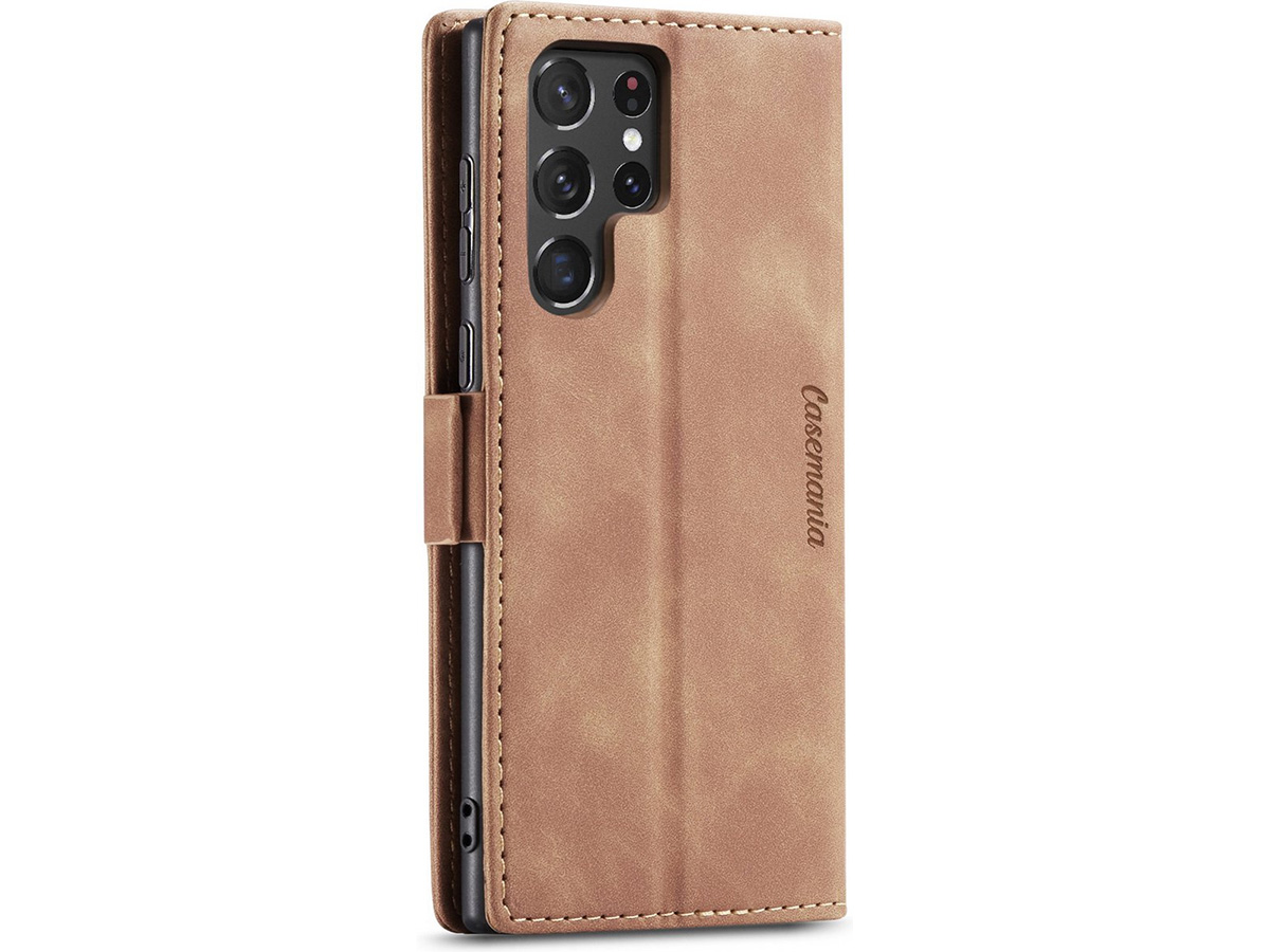 Dit slanke Samsung Galaxy S26 Ultra boek hoesje van CaseMania is uitgevoerd in hoogwaardig kunstleer met een prachtige vintage look die mooi afsteekt tegen de moderne look van het toestel zelf. De case is verkrijgbaar in verschillende fraaie kleuren.
