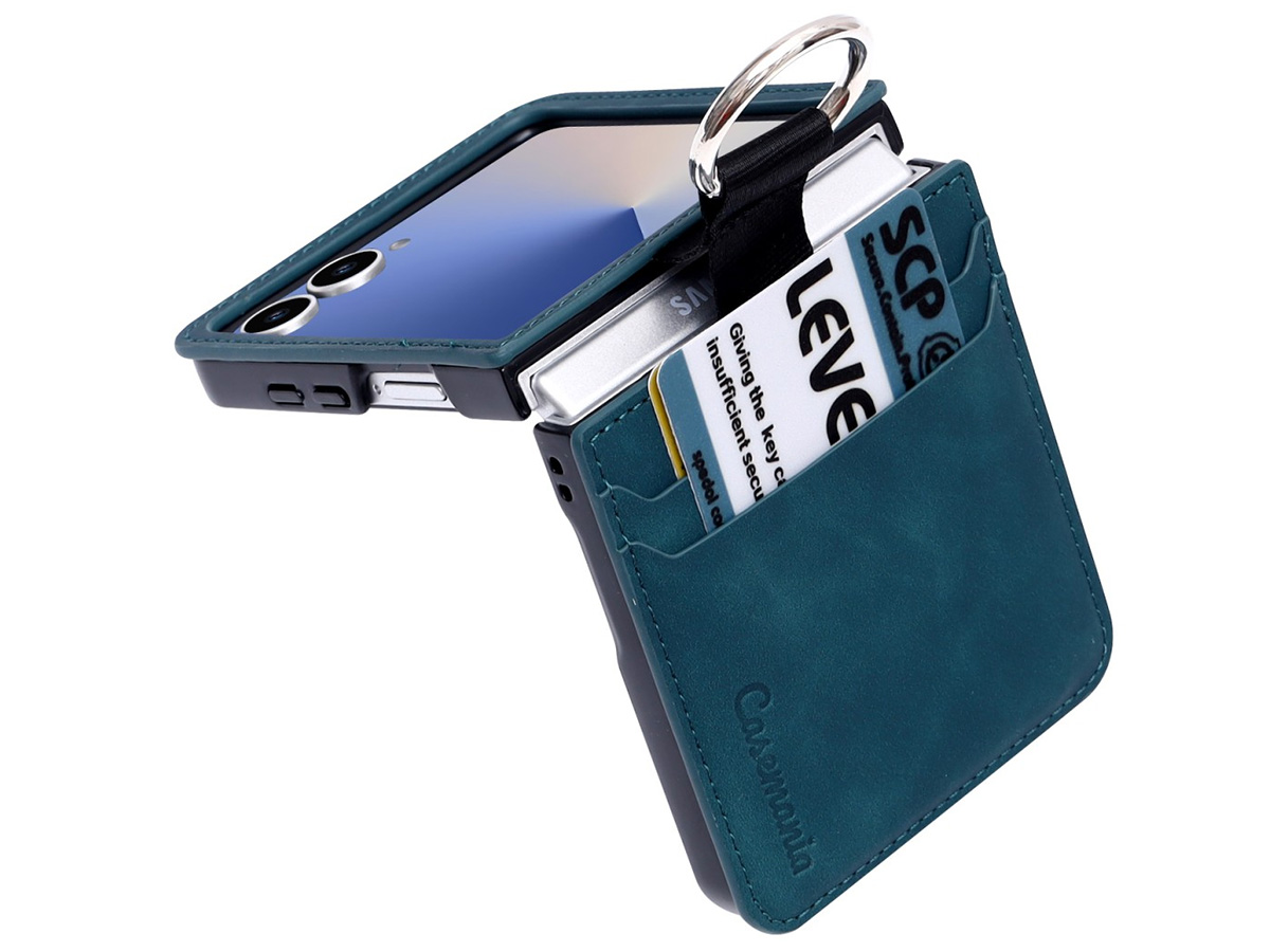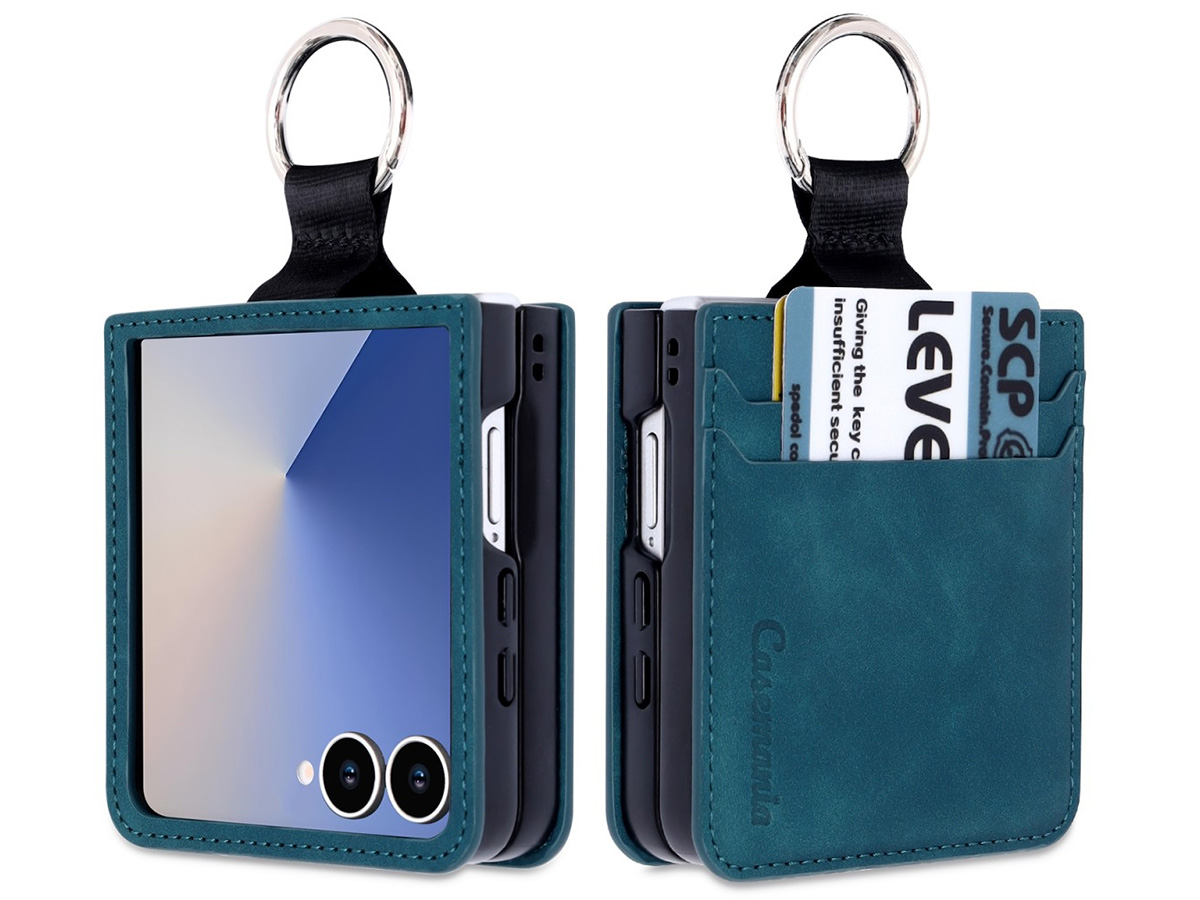 Dit CaseMania hoesje voor de Galaxy Z Flip 7 biedt meer dan bescherming alleen. Zo vindt u achterop de case drie handige pasvakjes voor uw passen en kaarten. Daarnaast is de case voorzien van een metalen karabijnhaak waarmee u uw toestel eenvoudig kunt vastclippen.