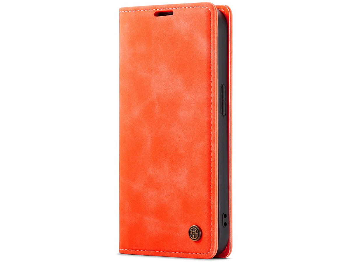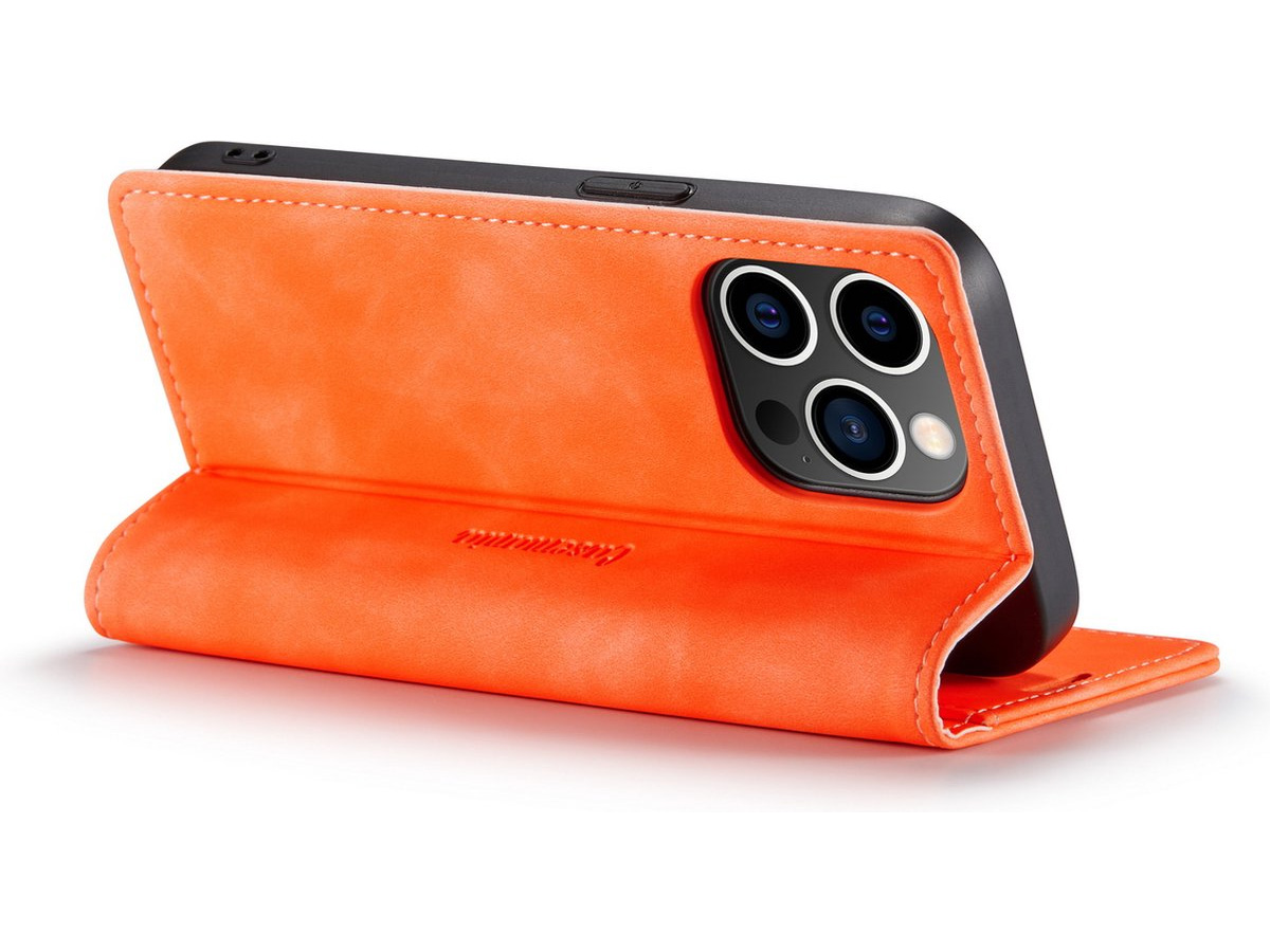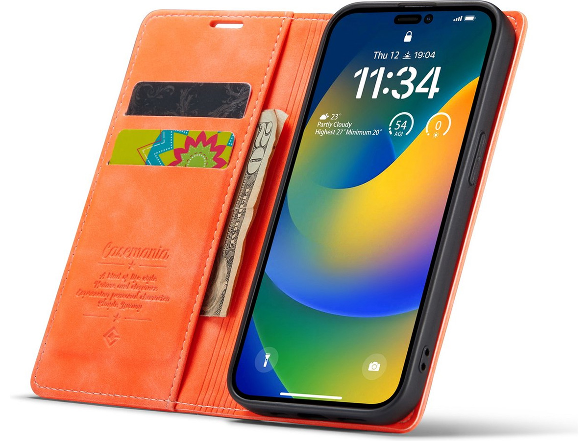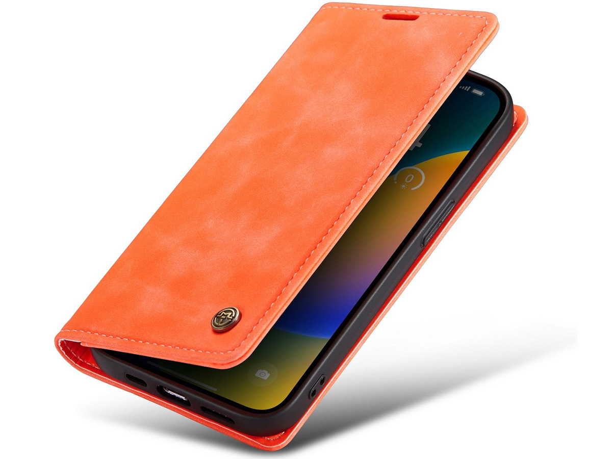Dit fraaie iPhone 14 Pro Max hoesje van het merk CaseMe is uitgevoerd in hoogwaardig kunstleer met een prachtige vintage look die mooi afsteekt tegen de moderne look van het toestel zelf. De case is verkrijgbaar in een grote range aan fraaie kleuren, waaronder deze zomerse oranje kleur.