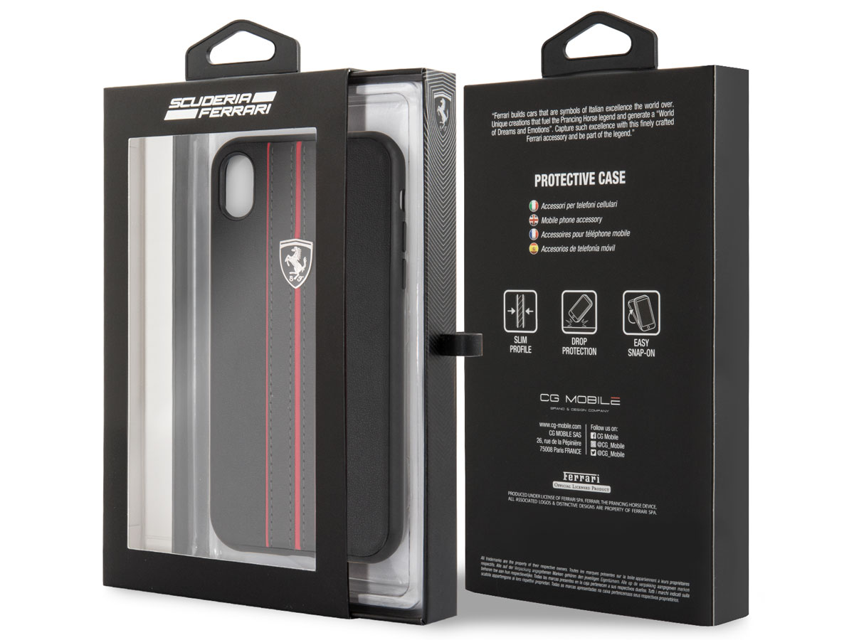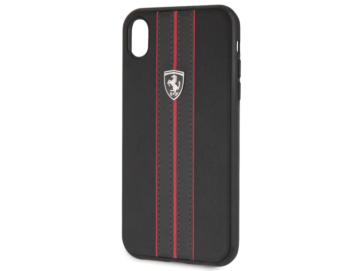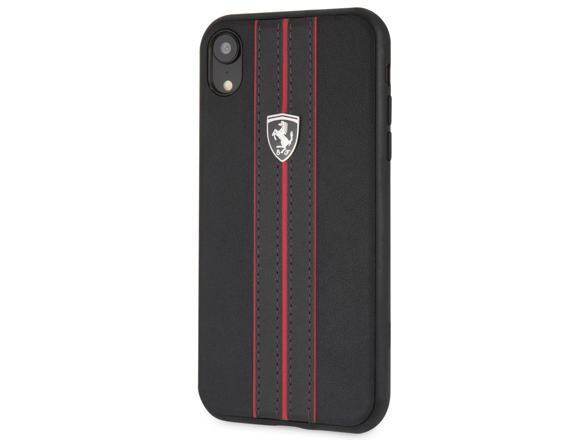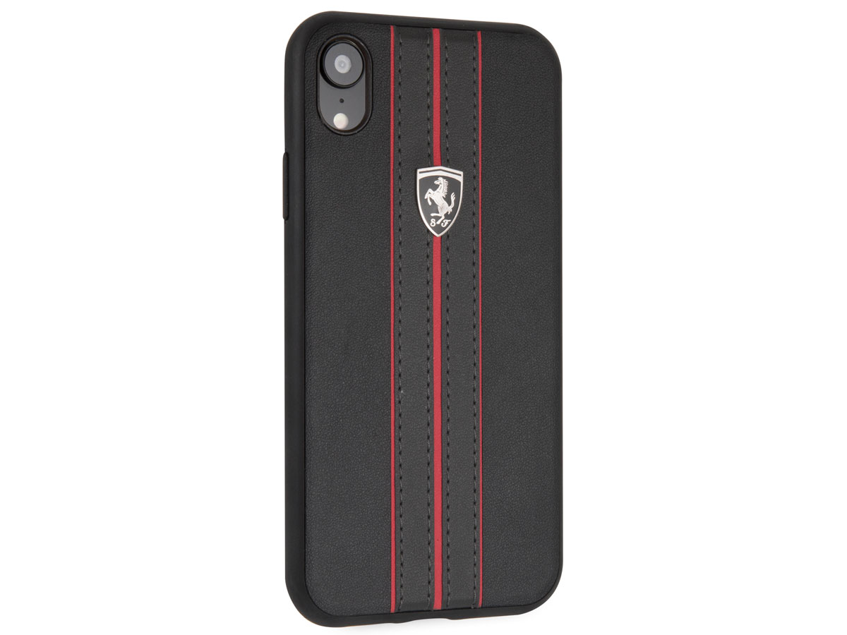 Dit originele Ferrari iPhone XR hoesje beschermt uw toestel in de stijl van dit geliefde merk. De case is bekleed met kunstleer, waar op fraaie wijze sportieve lijnen op gestikt zijn. De case wordt gesierd door een metalen Ferrari schildje in subtiel zwart.