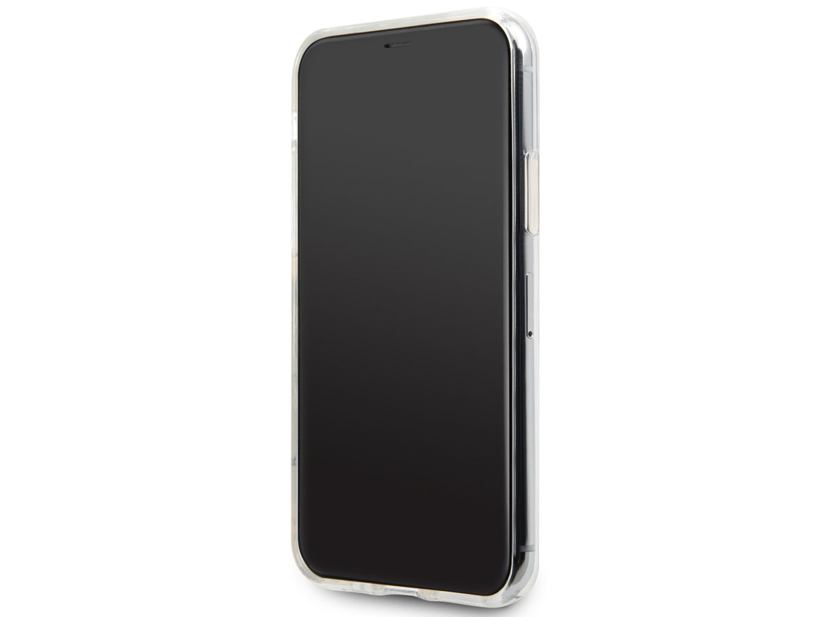 Dit Guess iPhone hoesje voor de iPhone 11 en iPhone XR is voorzien van het bekende Guess 4G Monogram in glanzend zilver, op een ondergrond van zilverkleurige glitters. De rand van de case is kleurdoorlatend, zodat de zorgvuldig uitgezochte kleur van uw iPhone 11 zichtbaar blijft.