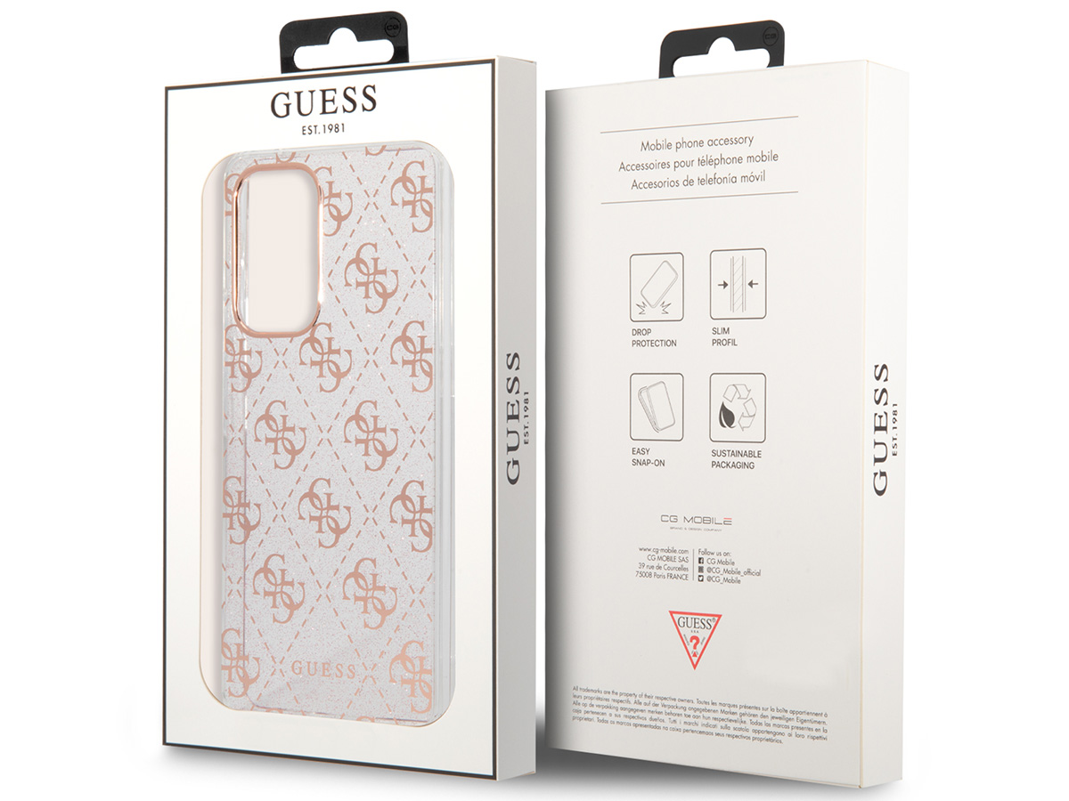Dit Guess Samsung Galaxy A53 hoesje is voorzien van het bekende Guess 4G Monogram in roze, op een ondergrond van zilverkleurige glitters. De gehele case is doorzichtig, zodat de zorgvuldig uitgezochte kleur van uw Samsung Galaxy A53 door het hoesje heen mooi zichtbaar blijft.