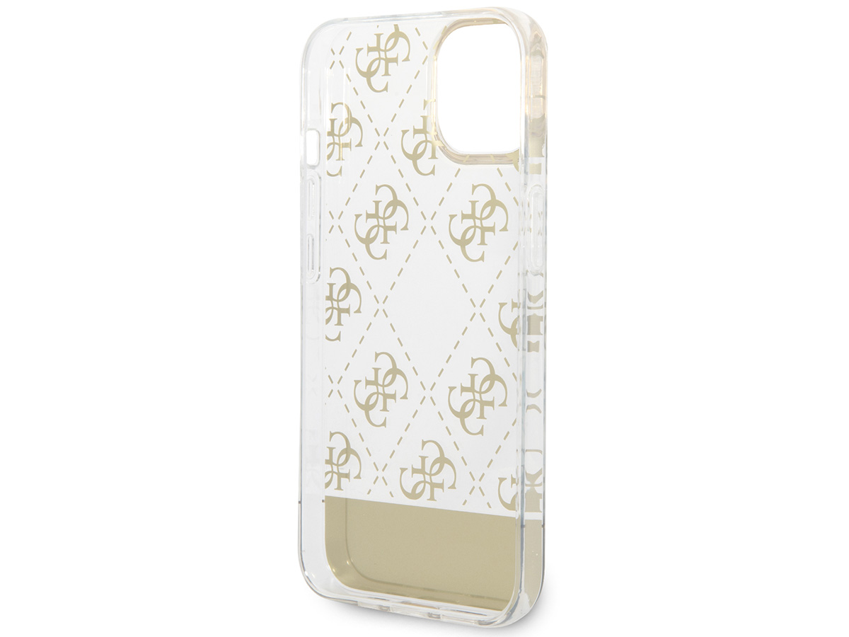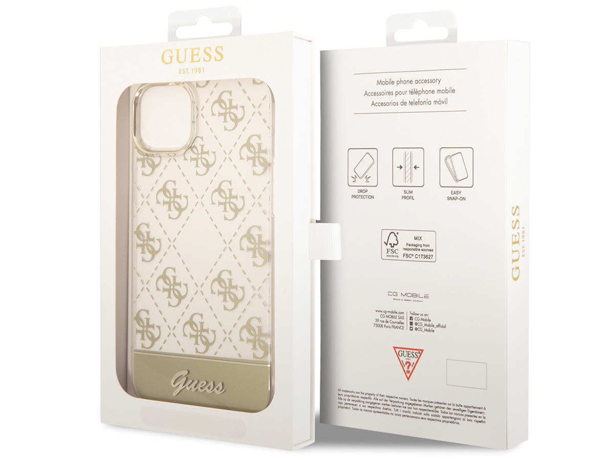 Dit originele Guess iPhone 14 hoesje is uitgevoerd in het bekende Guess monogram. Het patroon is "electroplated" (dus: glanzend) en beschikbaar in vier kleuren, in combinatie met goudkleurige details zoals het Guess logo en de afwerking rond de camera. Doordat het hoesje grotendeels doorzichtig is, blijft de kleur van uw toestel door de case heen zichtbaar.