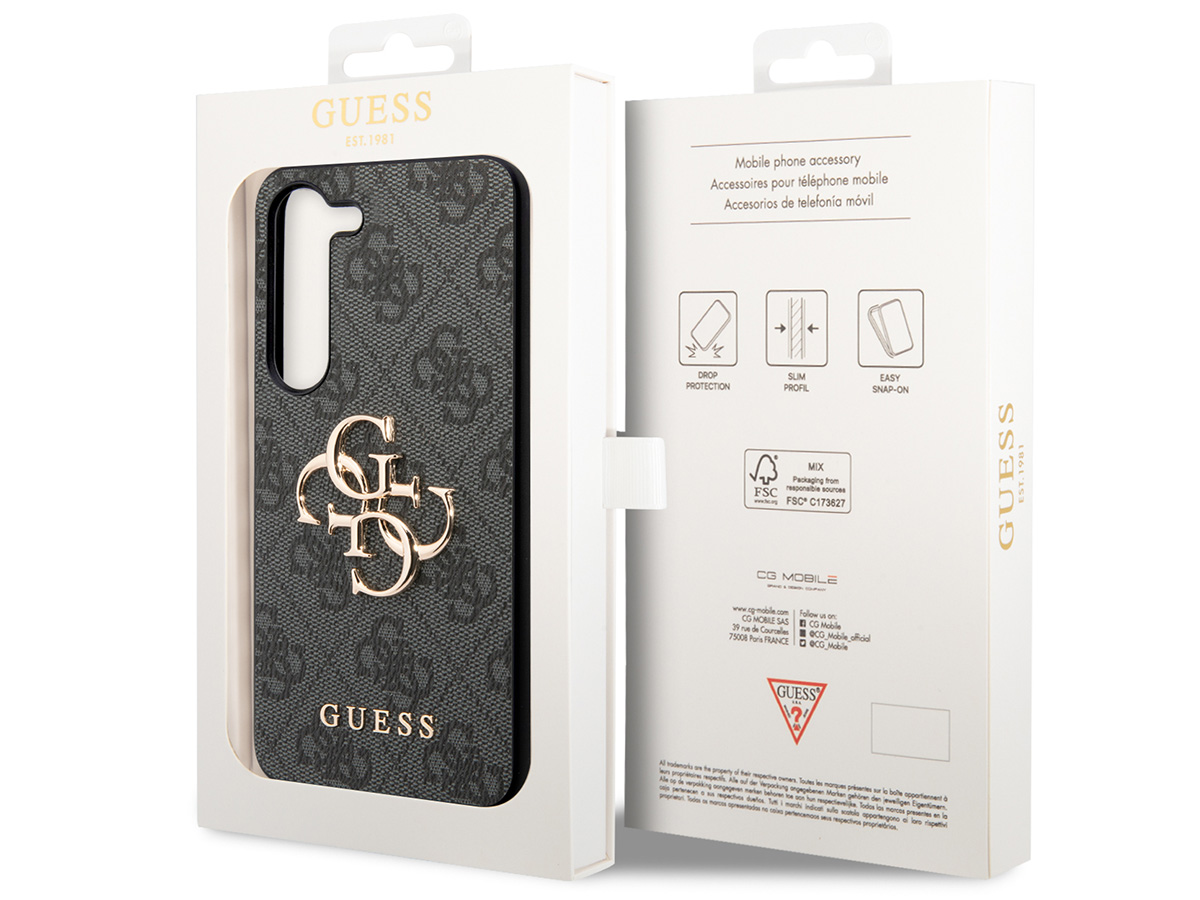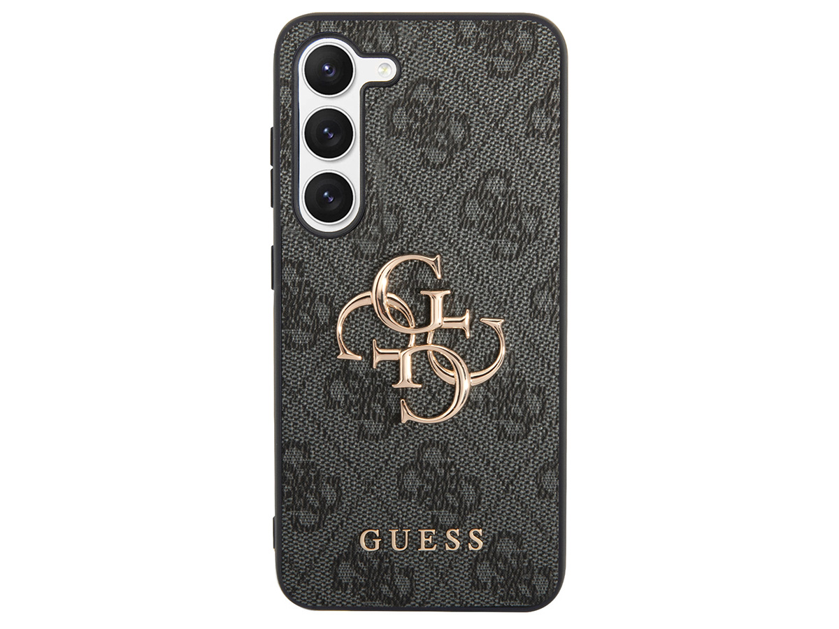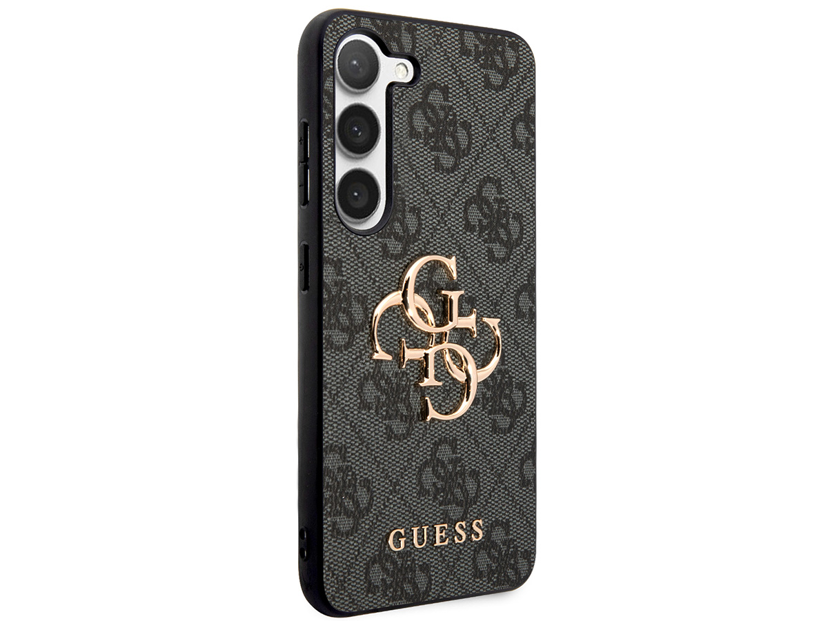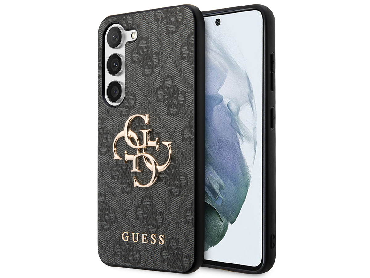 Dit originele Guess Samsung Galaxy S24+ hoesje is uitgevoerd in het bekende Guess monogram in het bruin, grijs of roze en wordt gesierd door een groot goudkleurig 4G embleem tezamen met een goudkleurig Guess logo.