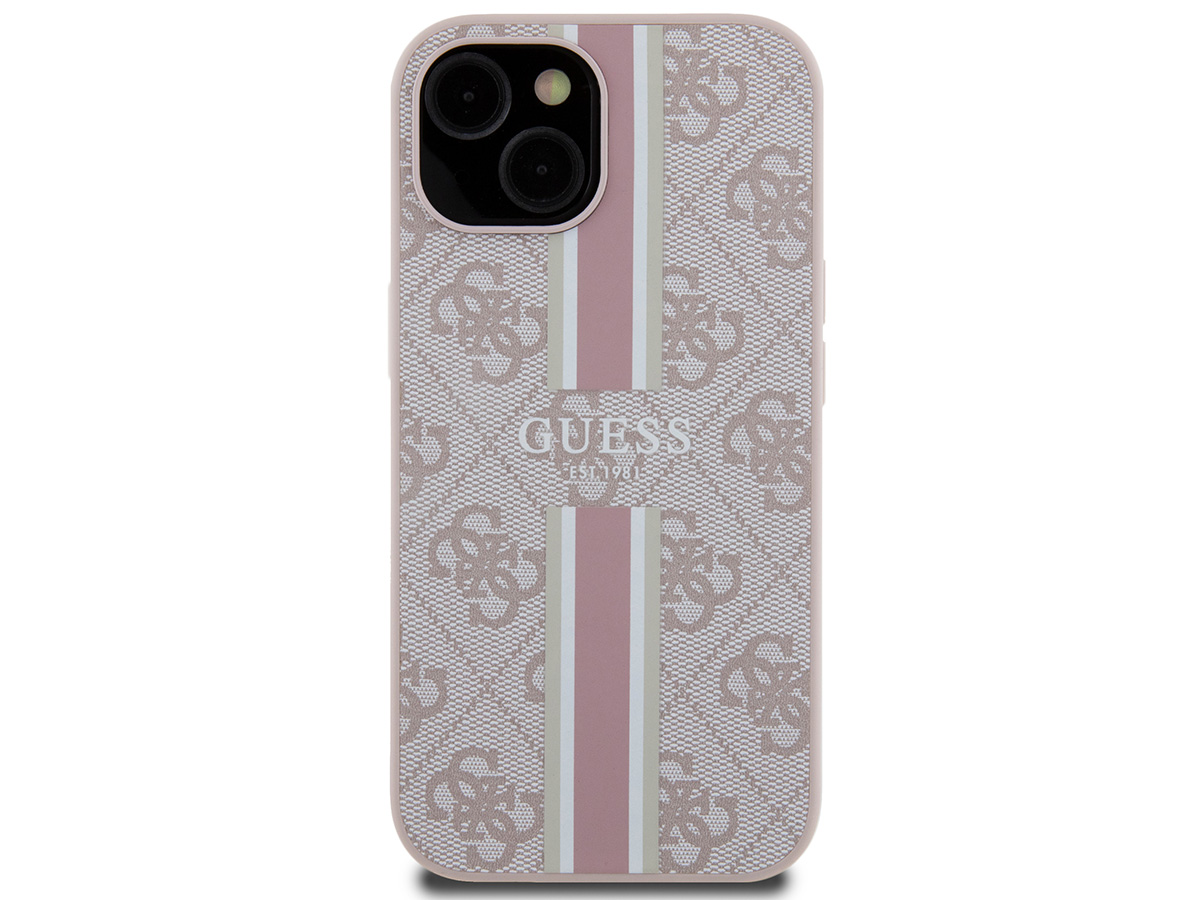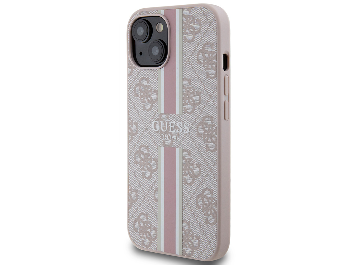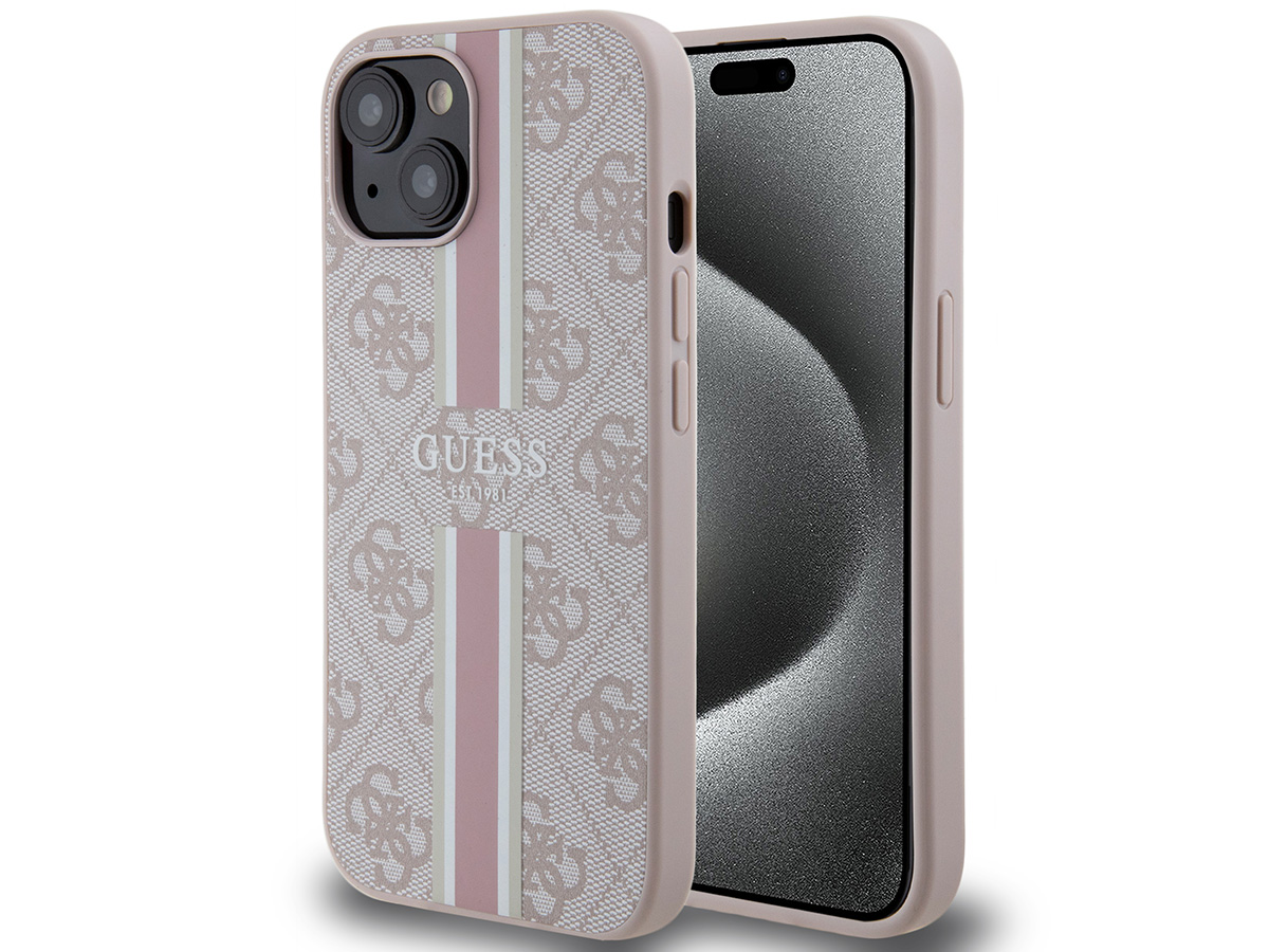 Dit originele Guess iPhone 15 hoesje is uitgevoerd in het bekende Guess monogram, naar keuze in het bruin, grijs of roze. Het monogram is voorzien van een stijlvolle streep met het Guess logo.