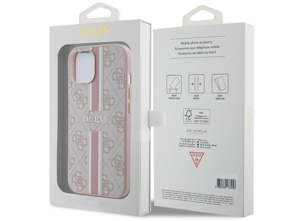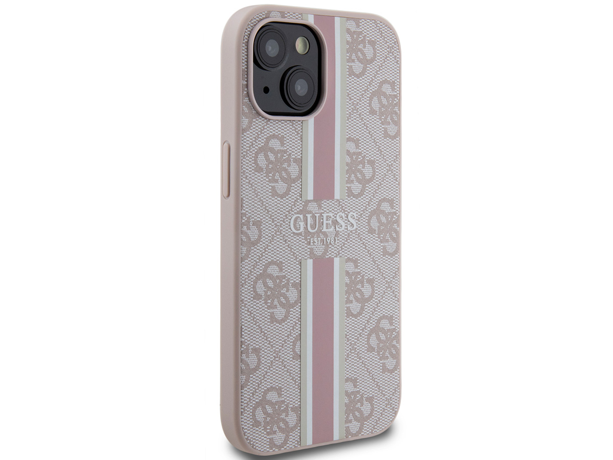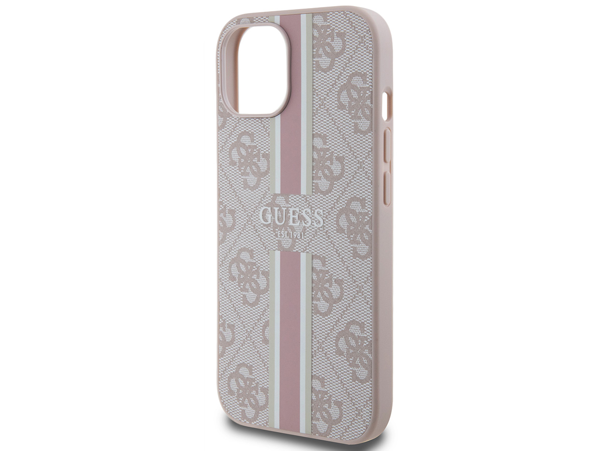 Dit originele Guess iPhone 15 hoesje is uitgevoerd in het bekende Guess monogram, naar keuze in het bruin, grijs of roze. Het monogram is voorzien van een stijlvolle streep met het Guess logo.