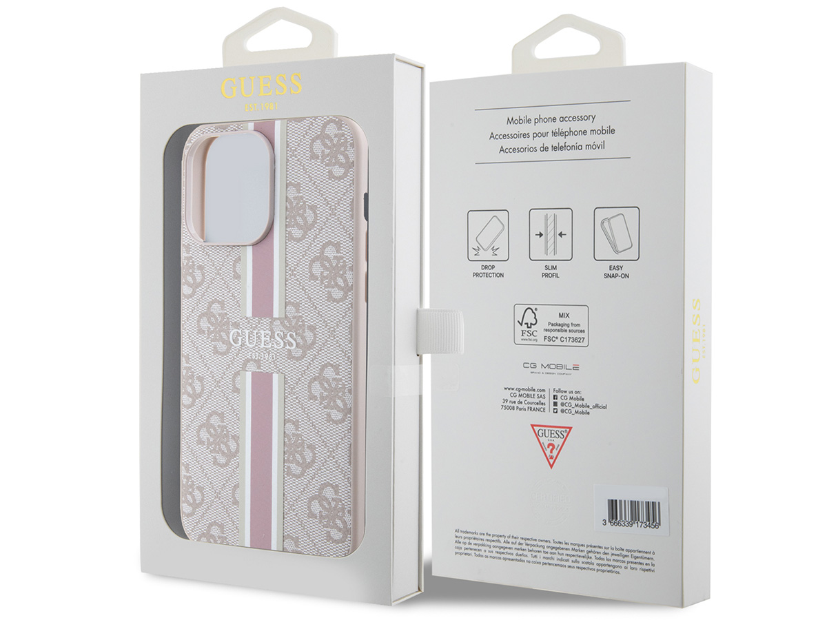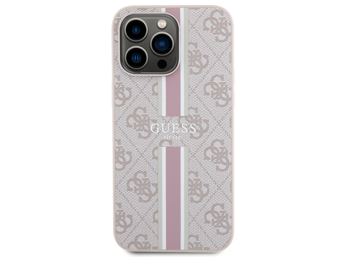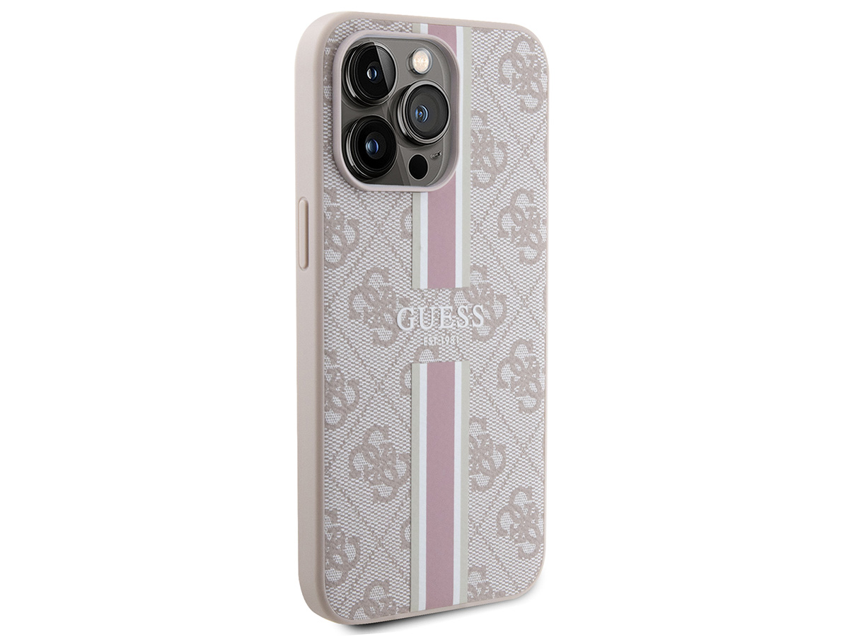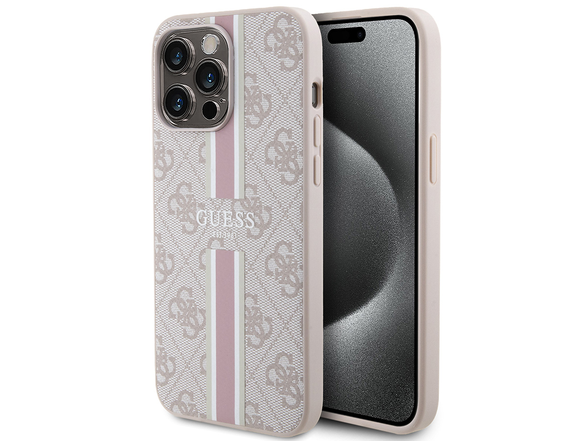 Dit originele Guess iPhone 15 Pro Max hoesje is uitgevoerd in het bekende Guess monogram, naar keuze in het bruin, grijs of roze. Het monogram is voorzien van een stijlvolle streep met het Guess logo.