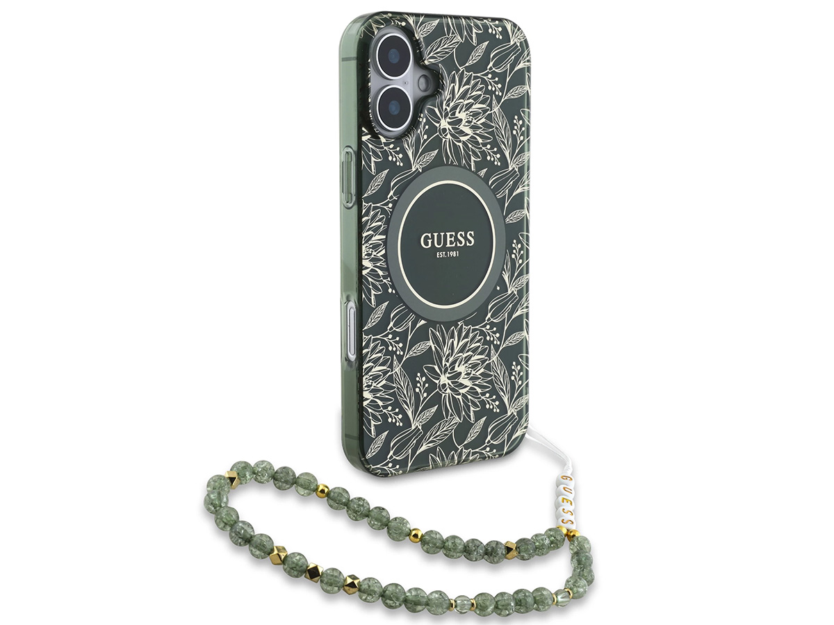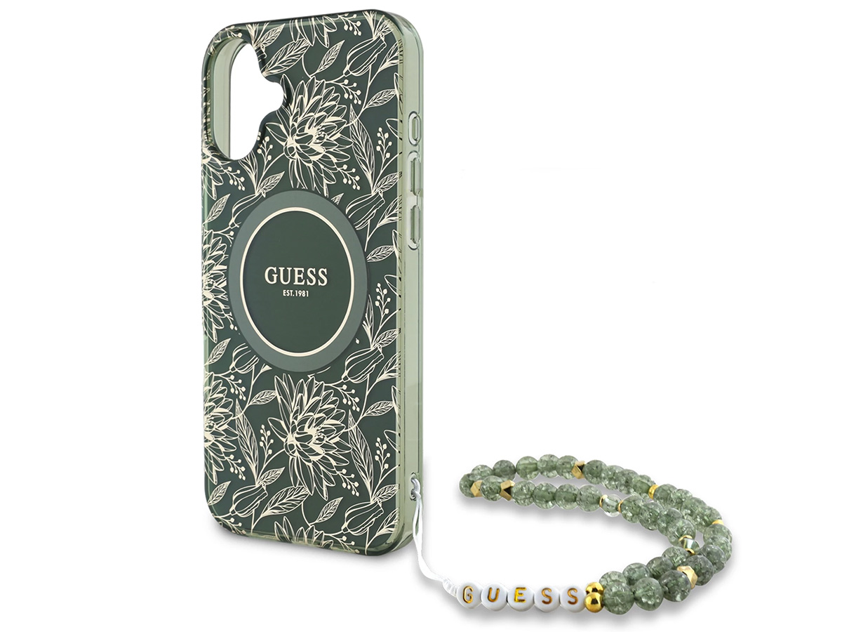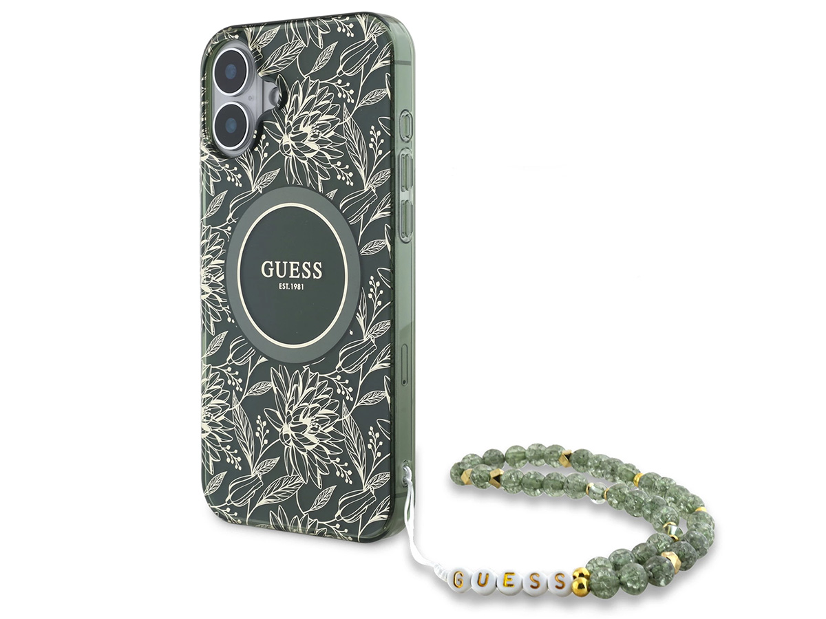 Guess Floral Wristlet Charm Case Groen - iPhone 16 Plus hoesje met Polsbandje