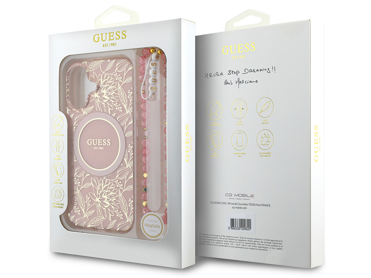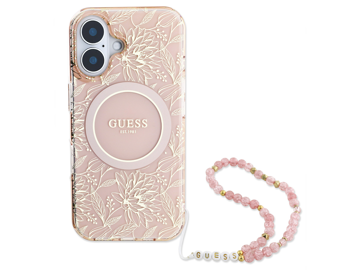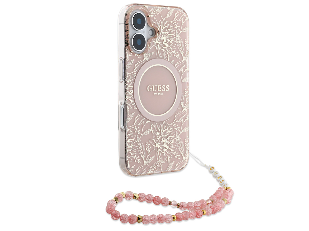 Guess Floral Wristlet Charm Case Roze - iPhone 16 Plus hoesje met Polsbandje