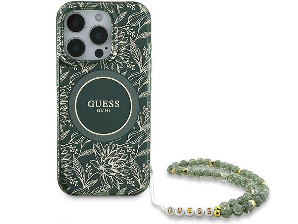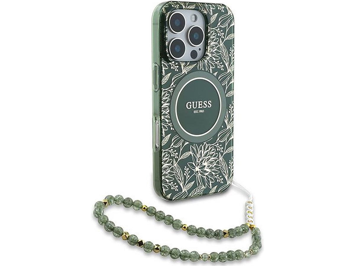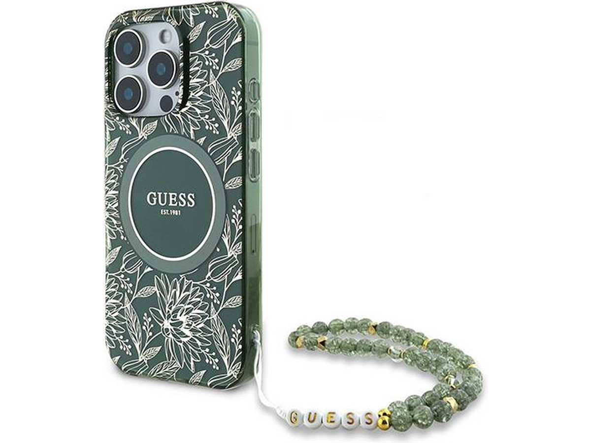 Guess Floral Wristlet Charm Case Groen - iPhone 16 Pro hoesje met Polsbandje