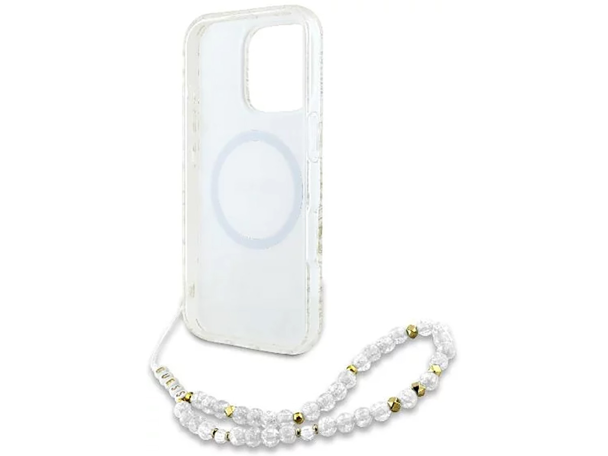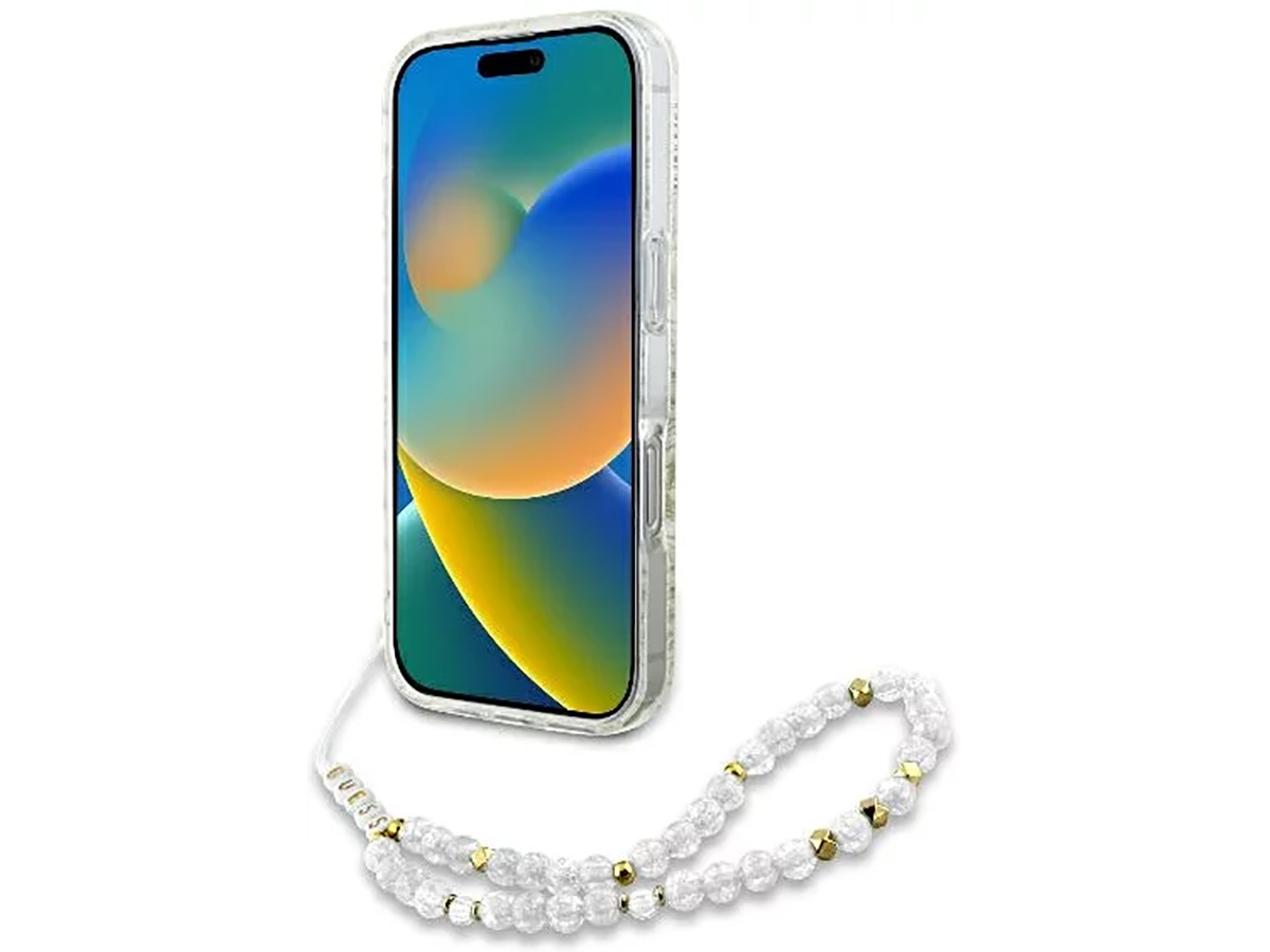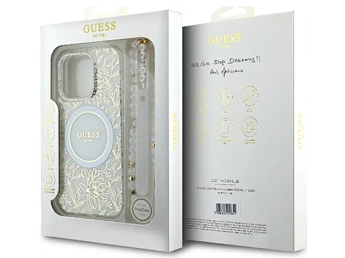 Guess Floral Wristlet Charm Case Wit - iPhone 16 Pro hoesje met Polsbandje