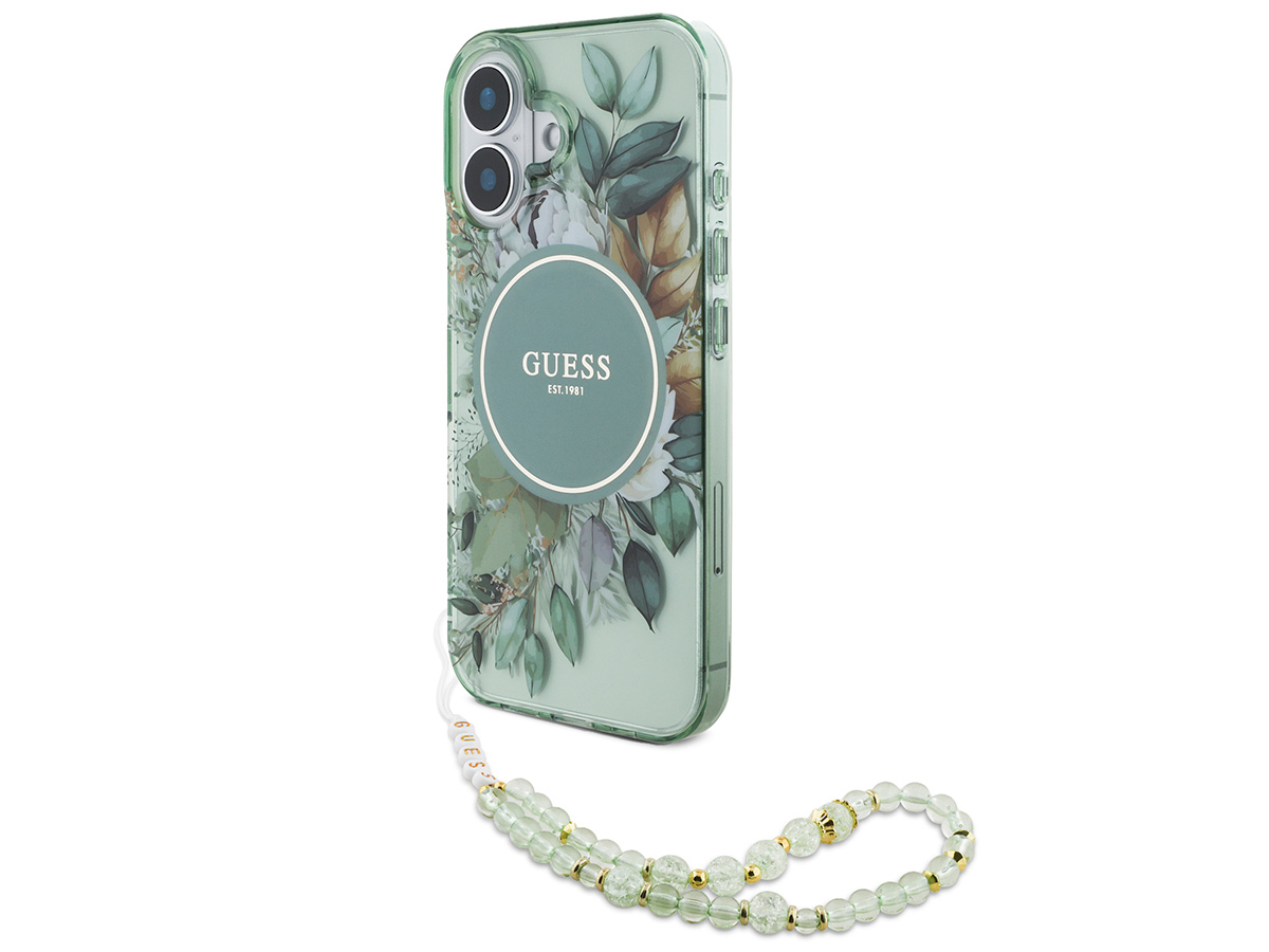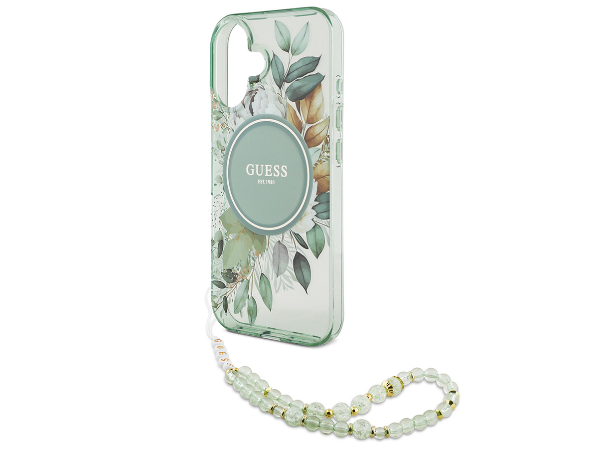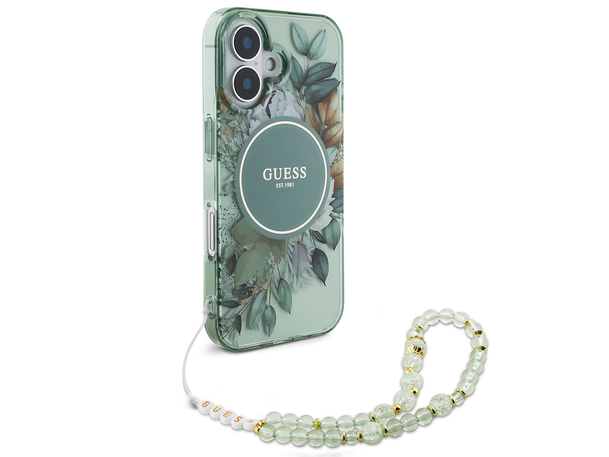 Guess Flower Wristlet Charm Case Groen - iPhone 16 hoesje met Polsbandje