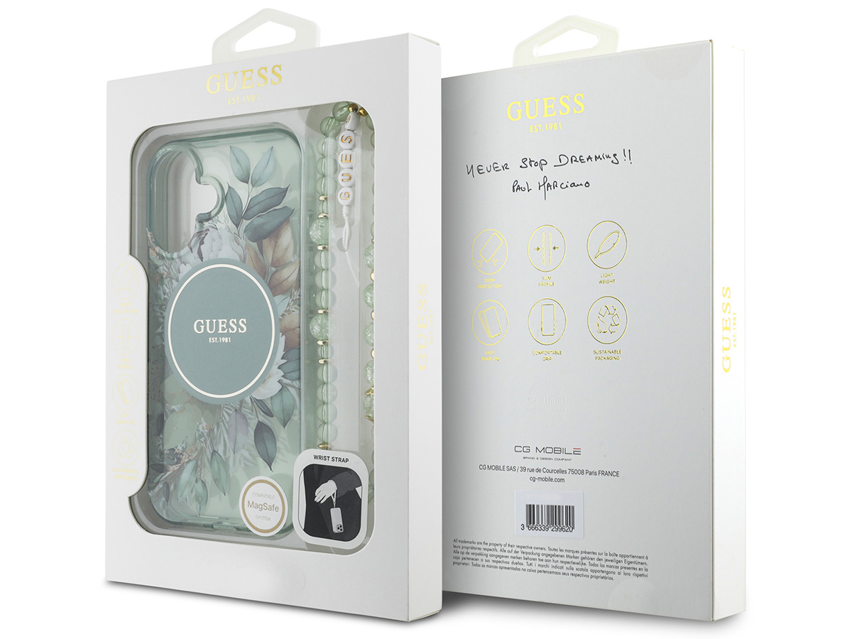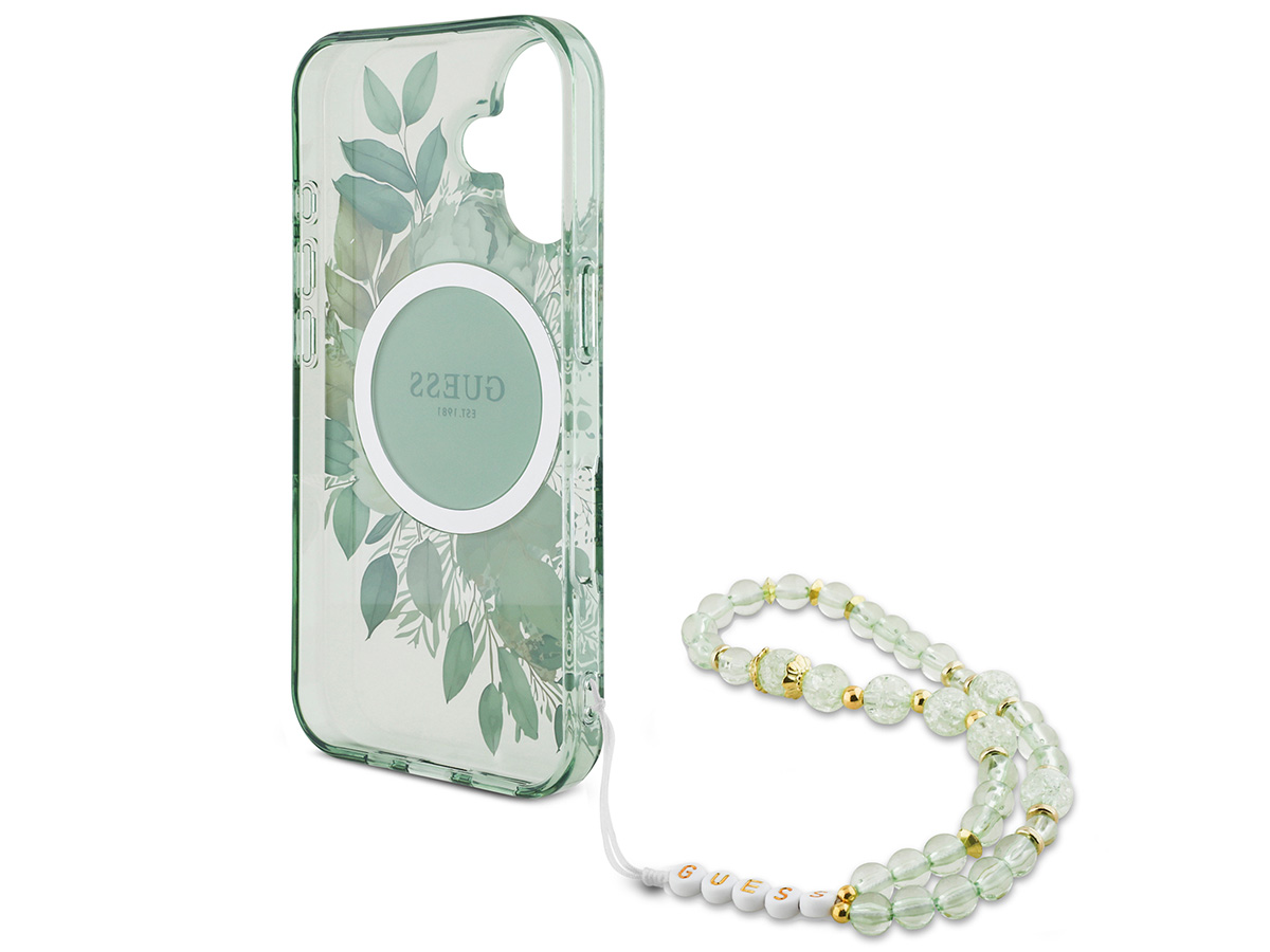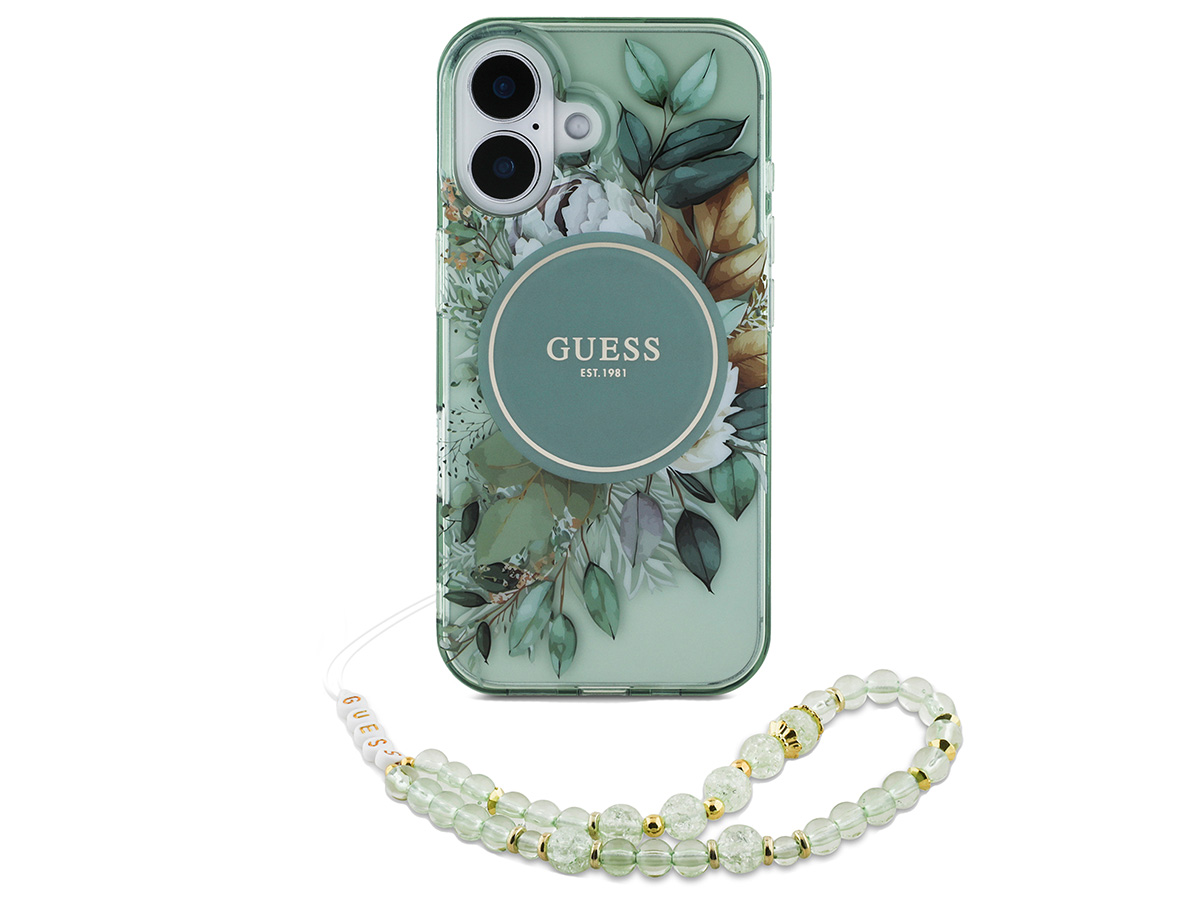 Guess Flower Wristlet Charm Case Groen - iPhone 16 hoesje met Polsbandje