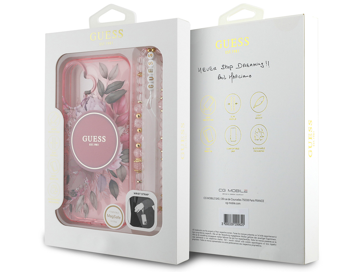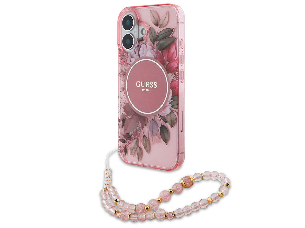 Guess Flower Wristlet Charm Case Roze - iPhone 16 Plus hoesje met Polsbandje