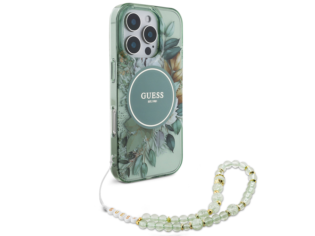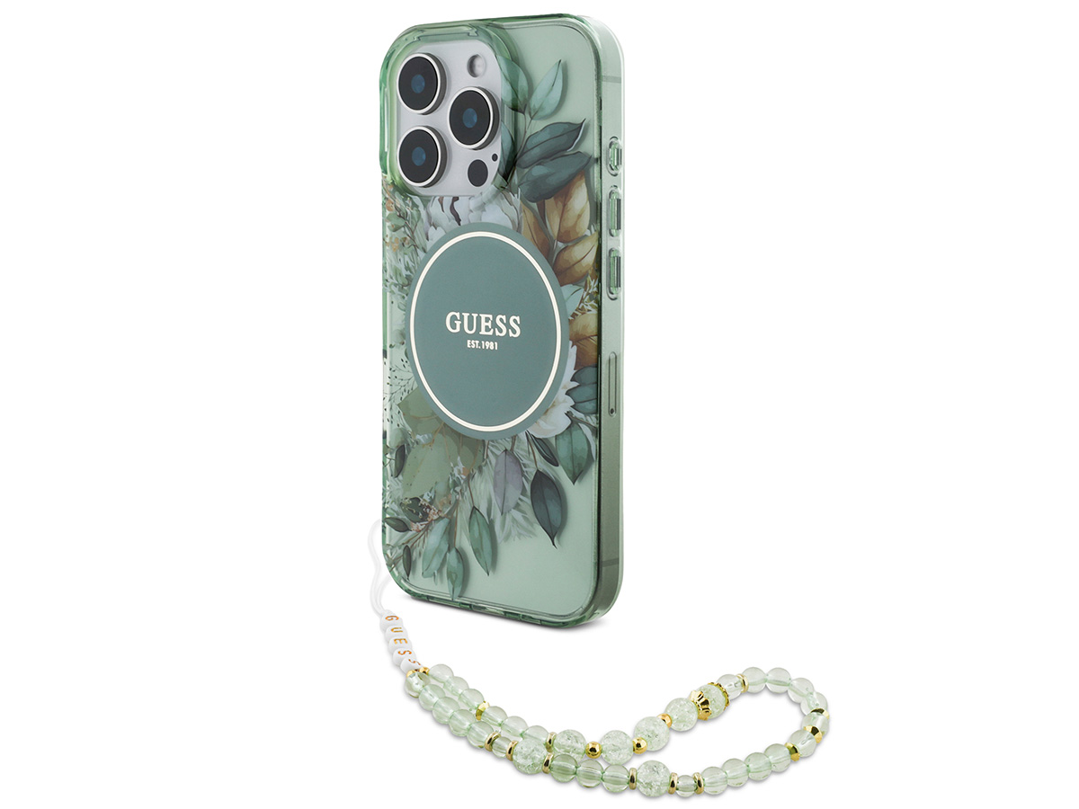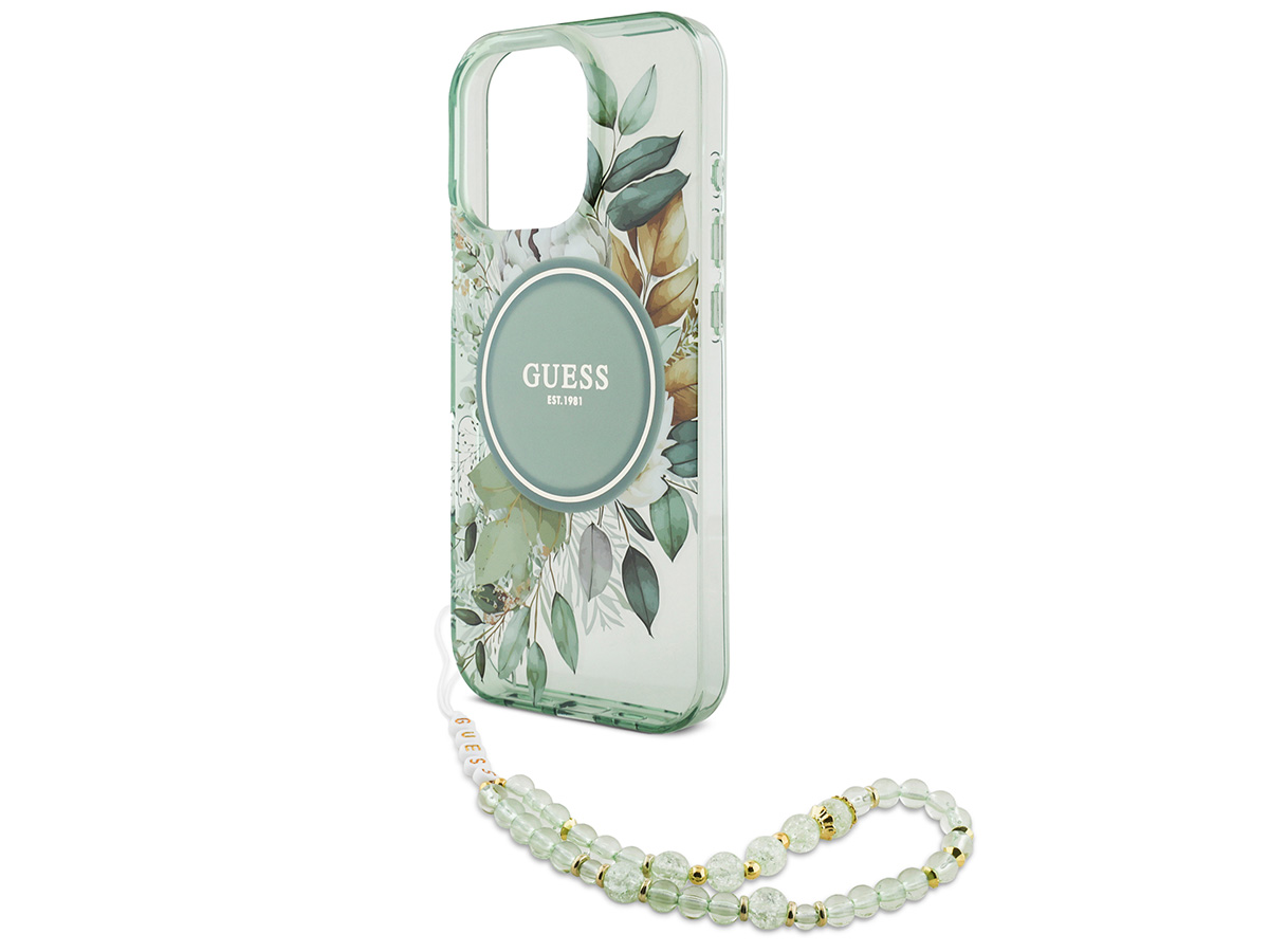Guess Flower Wristlet Charm Case Groen - iPhone 16 Pro Max hoesje met Polsbandje