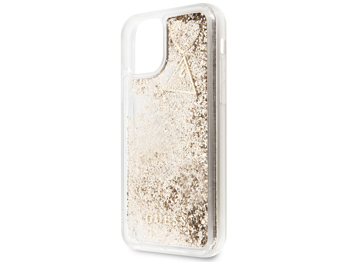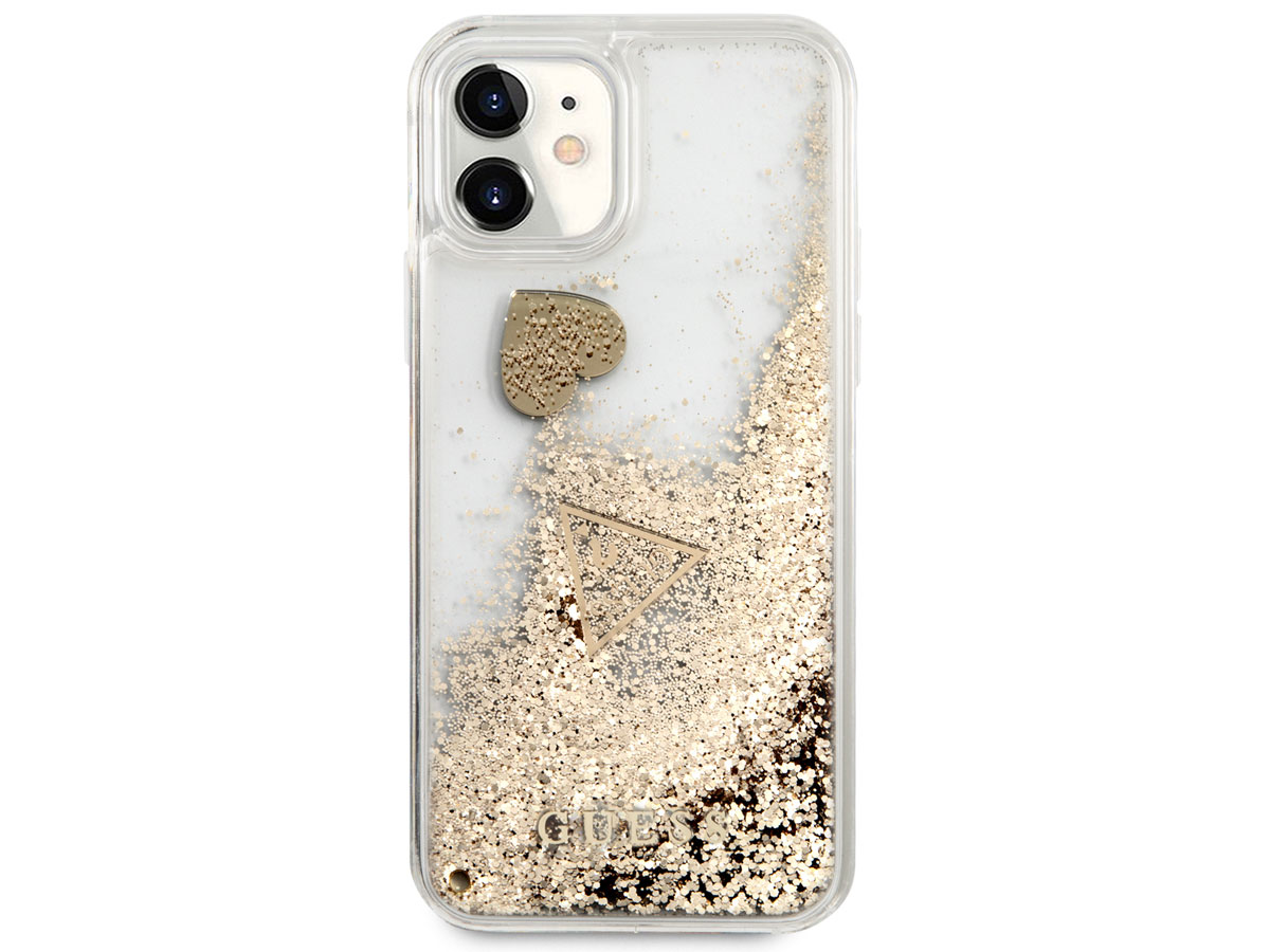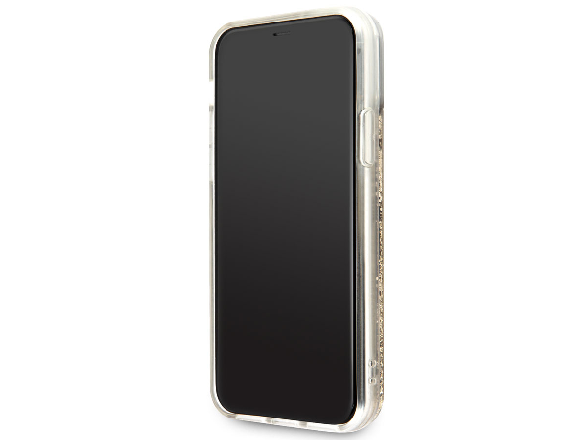 Het Guess telefoonhoesje is volledig doorzichtig met een met vloeistof gevulde achterkant, waar duizenden gouden glitters en Guess charms in ronddwarrelen. Het verveelt daardoor nooit om naar deze iPhone 11 case te kijken! De met zorg uitgekozen kleur van uw iPhone blijft hierdoor ook door de case zichtbaar.