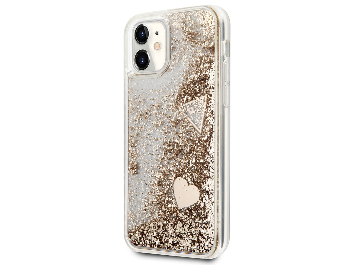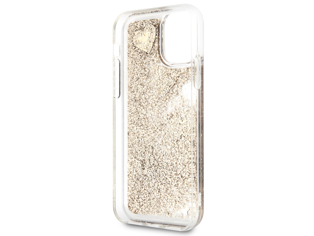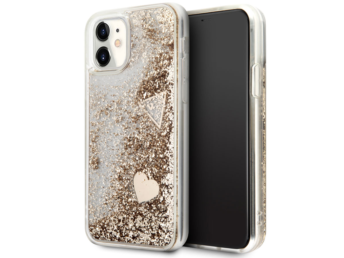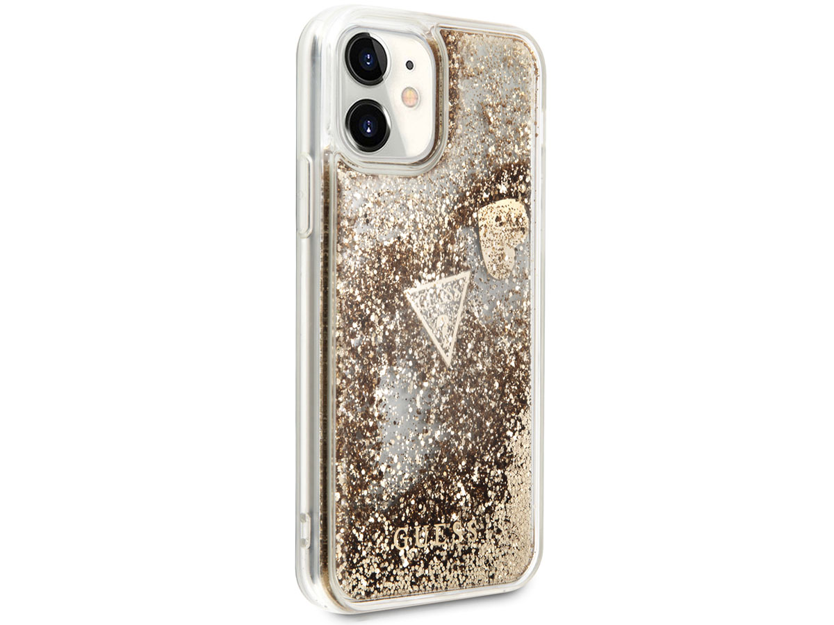 Het Guess telefoonhoesje is volledig doorzichtig met een met vloeistof gevulde achterkant, waar duizenden gouden glitters en Guess charms in ronddwarrelen. Het verveelt daardoor nooit om naar deze iPhone 11 case te kijken! De met zorg uitgekozen kleur van uw iPhone blijft hierdoor ook door de case zichtbaar.