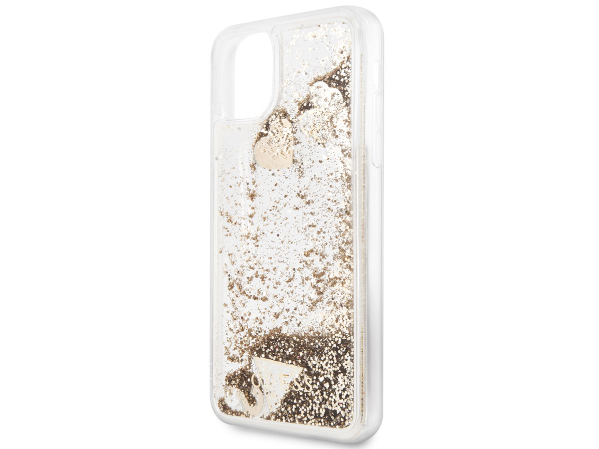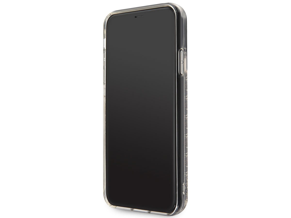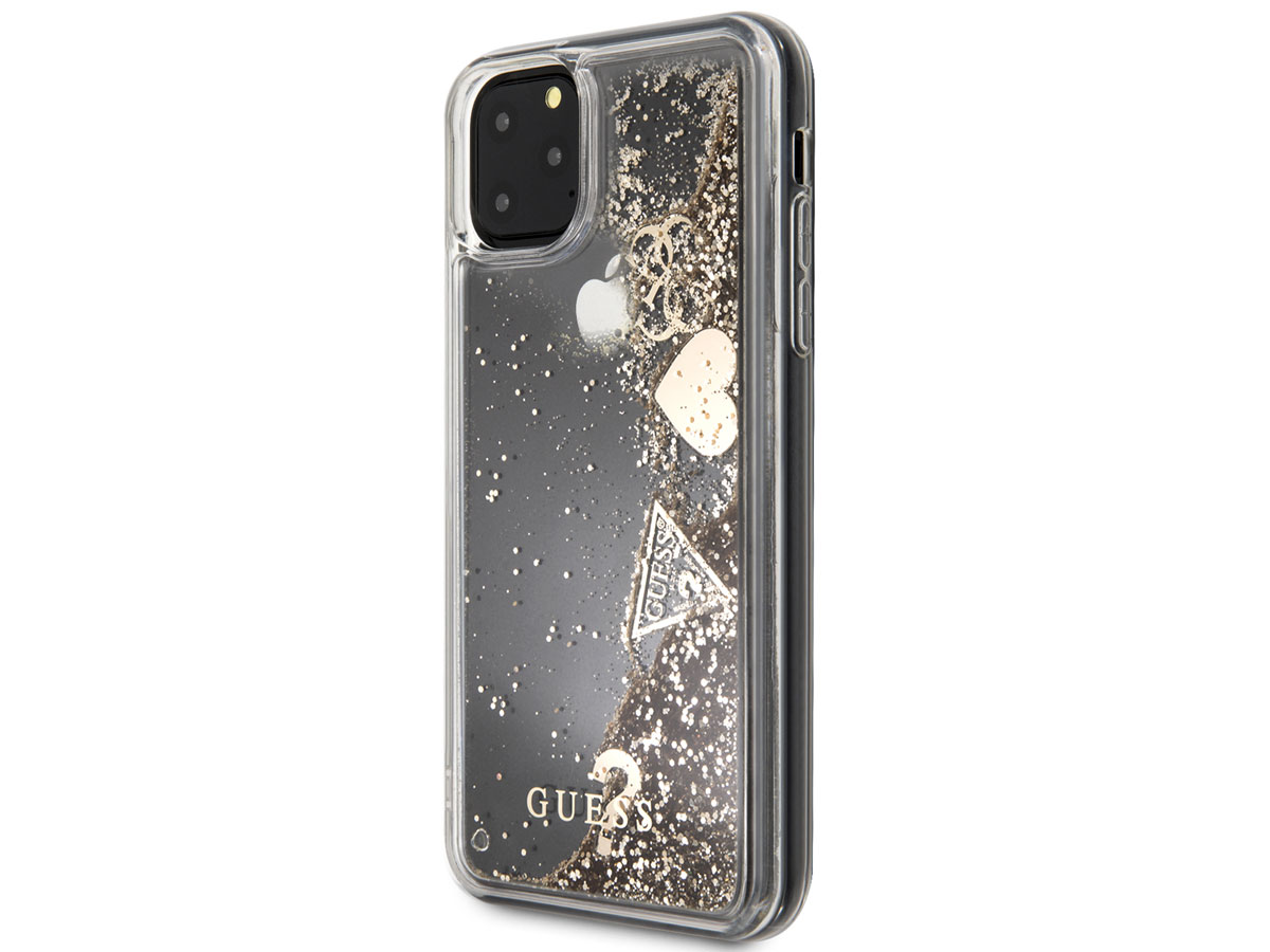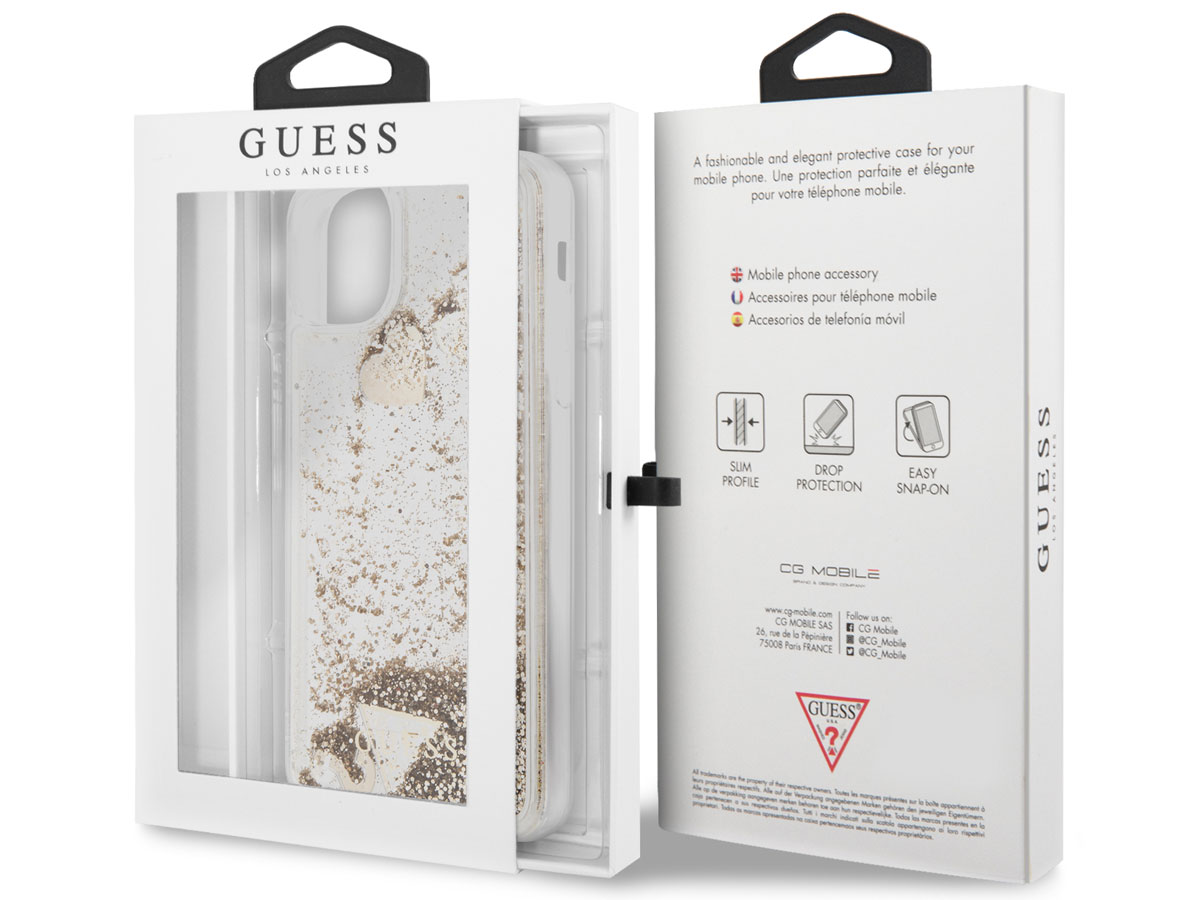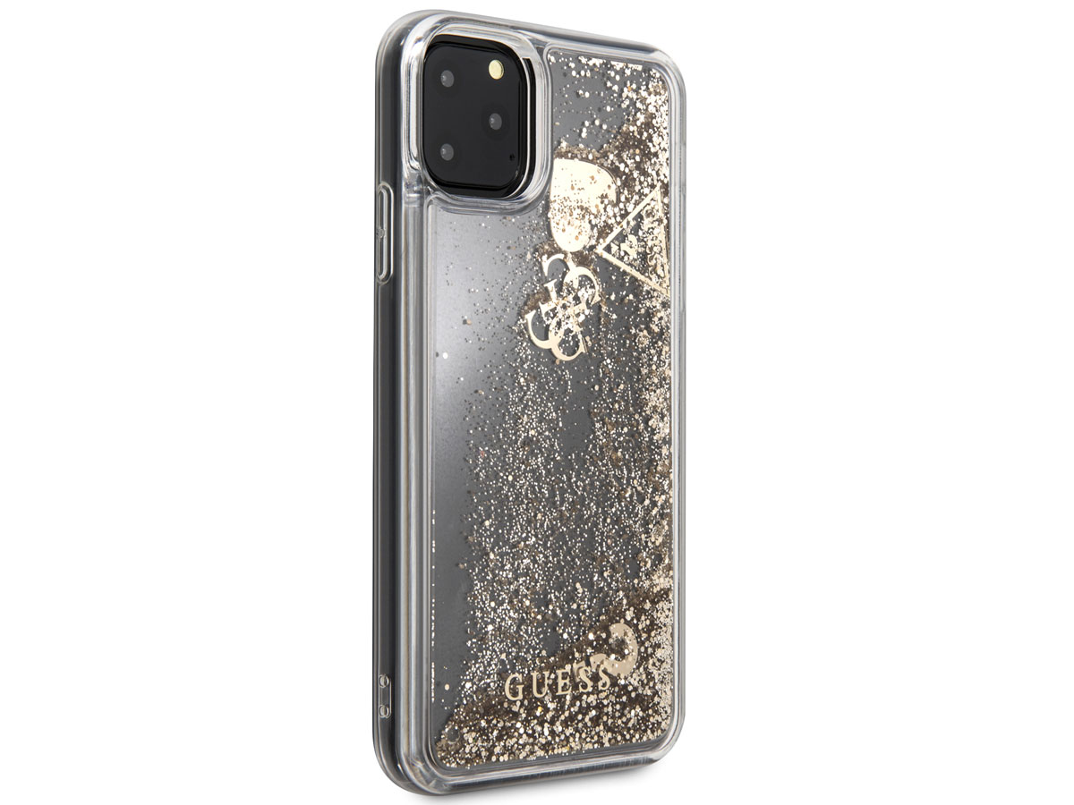 Het Guess telefoonhoesje is volledig doorzichtig met een met vloeistof gevulde achterkant, waar duizenden gouden glitters en Guess charms in ronddwarrelen. Het verveelt daardoor nooit om naar deze iPhone 11 Pro Max case te kijken! De met zorg uitgekozen kleur van uw iPhone blijft hierdoor ook door de case zichtbaar.