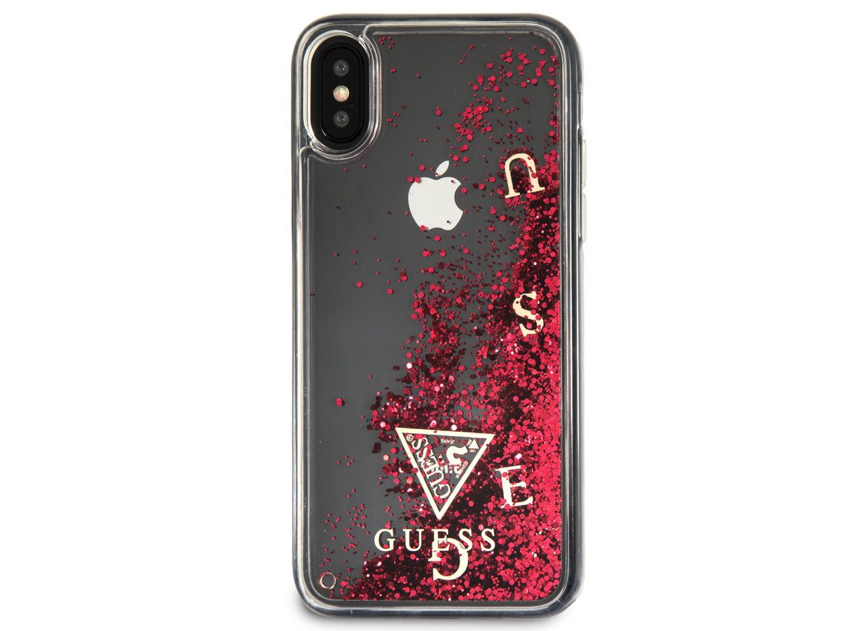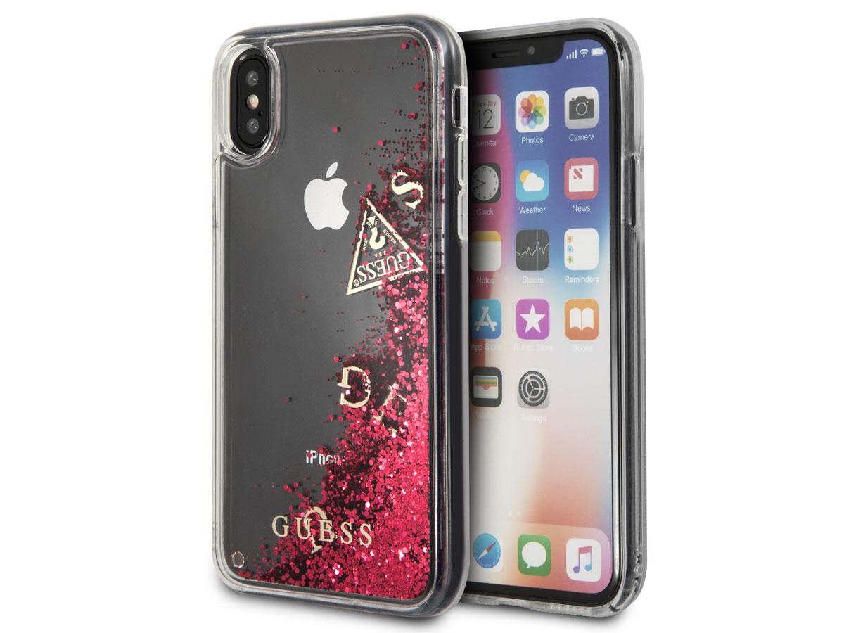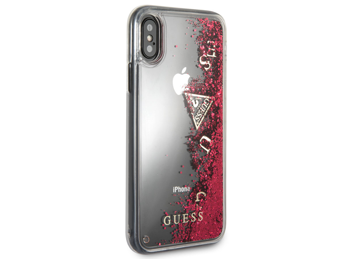 Dit bijzondere Guess iPhone X/Xs hoesje komt uit de Glitter Collectie. De case is grotendeels doorzichtig, maar heeft een met vloeistof gevulde achterkant waar duizenden roze glitters in ronddwarrelen. En als je goed kijkt, dwarrelt het Guess logo er ook tussenin! Het verveelt nooit om naar deze iPhone X/Xs case te kijken.