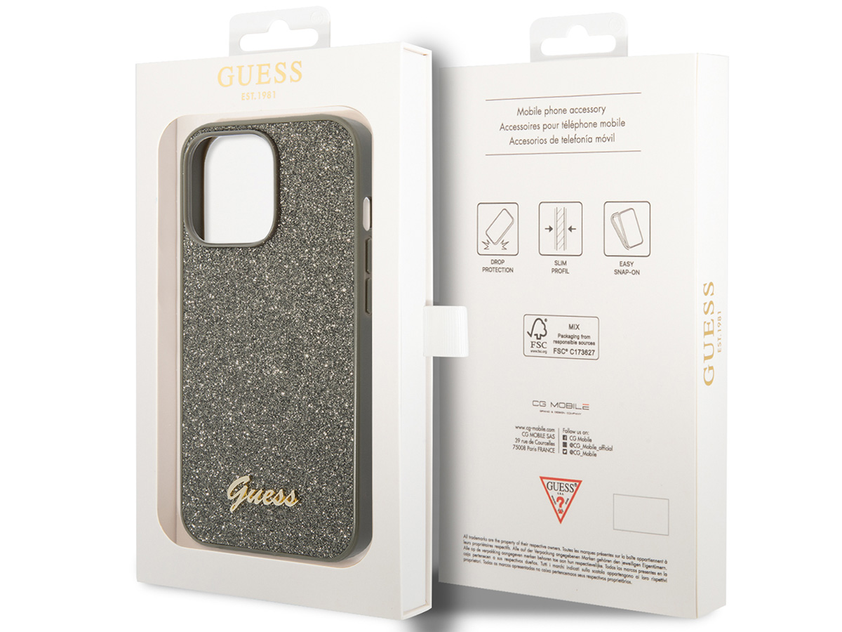 Dit originele Guess iPhone 14 Pro Max hoesje glinstert en schittert je tegemoet. De achterzijde is ingelegd met kunstleer met duizenden glitters, die ín het materiaal zitten en daardoor niet kunnen wegslijten of afgeven. De case is verkrijgbaar in vier kleuren en wordt gesierd door het sierlijke, goudkleurige Guess logo.