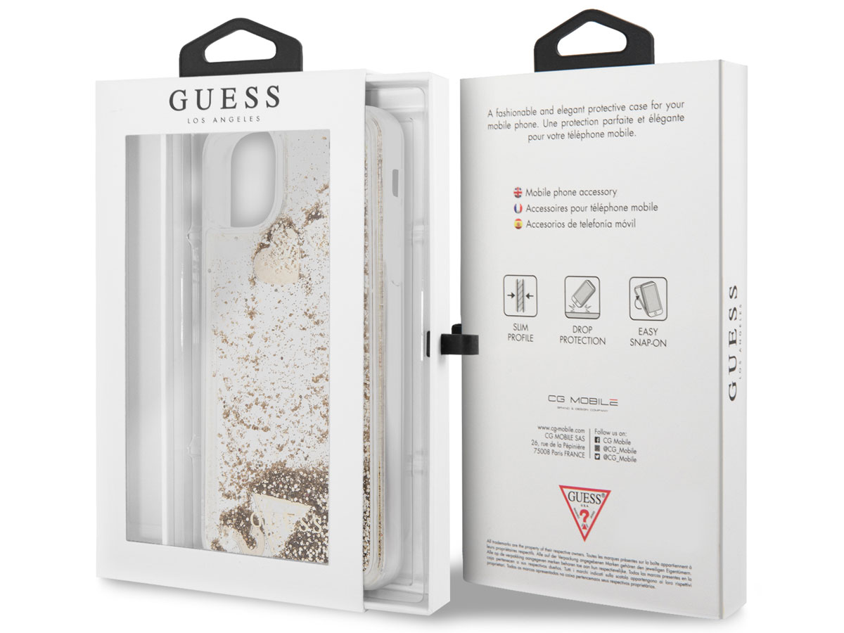 Het Guess telefoonhoesje is volledig doorzichtig en heeft een met vloeistof gevulde achterkant. Hierin dwarrelen duizenden gouden glitters en verschillende Guess charms in rond. Het verveelt daardoor nooit om naar deze iPhone case te kijken! De met zorg uitgekozen kleur van uw iPhone 12/12 Pro blijft bovendien ook door de case heen zichtbaar.