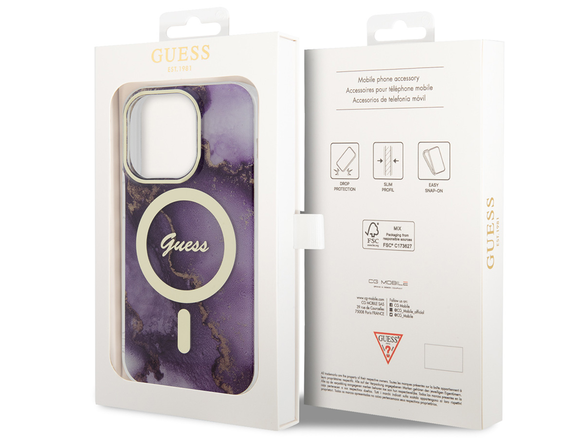Dit originele Guess iPhone 14 Pro Max hoesje is gemaakt van onbreekbaar, schokabsorberend TPU materiaal dat is bedrukt met een stijlvolle marmer print in bij de iPhone passend paars. De case is voorzien van goudkleurige details rond de camera, het Guess logo en de MagSafe ring. Dit hoesje is namelijk compatible met Apple MagSafe!