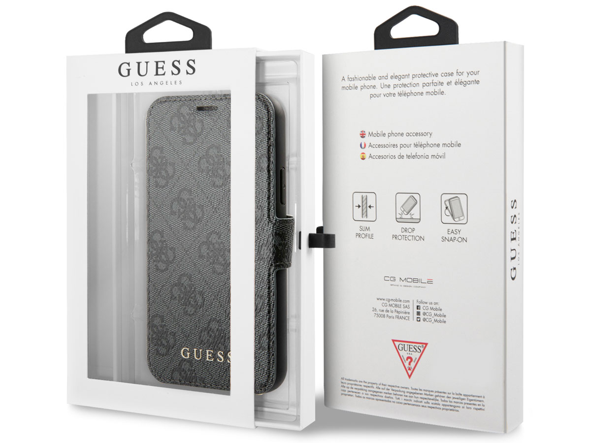 Dit Guess iPhone 11 hoesje is uitgevoerd in het klassieke Guess 4G monogram. De case is verkrijgbaar in een bruine of grijze uitvoering. Het sierlijke Guess logo staat in goudkleurige letters voorop, en komt nogmaals terug in de grijze microfiber voering van de case.