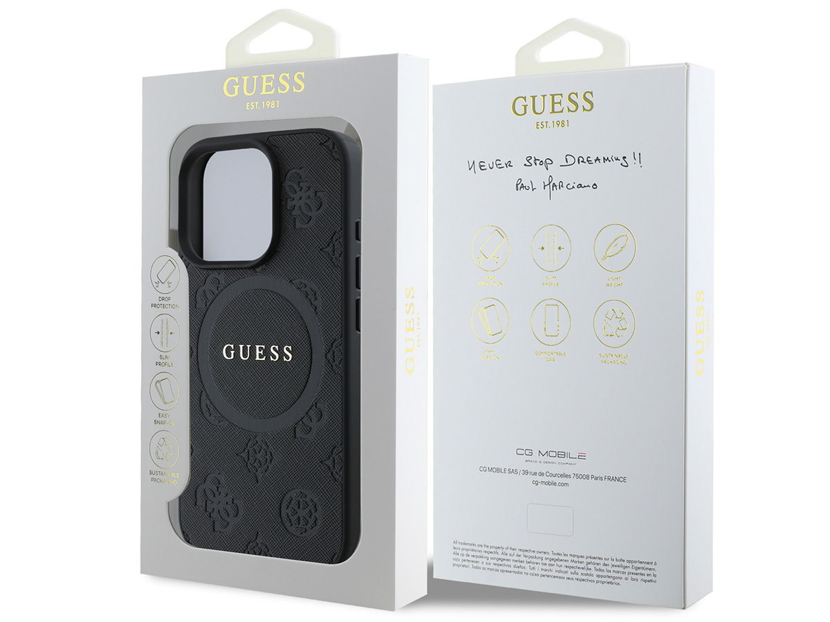 Dit originele Guess iPhone 16 Pro Max hoesje is uitgevoerd in hoogwaardig kunstleer met een Saffiano look. Het Guess Peony logo is in het materiaal aangebracht door middel van reliefdruk. Centraal op de case is het goudkleurige Guess logo ingelegd en benadrukt de circel de compatabiliteit met MagSafe.