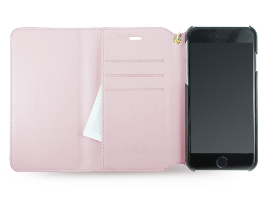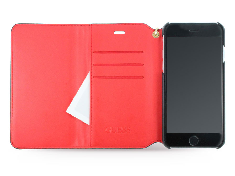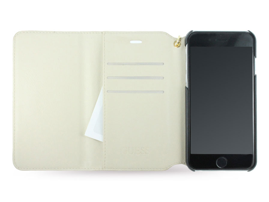 Het iPhone 6/6s hoesje biedt uw iPhone volledige bescherming rondom, sluit met een magneetsluiting en houdt rekening met alle toetsen, aansluitingen en de camera. Het is mogelijk om met de case dicht te bellen en het Guess hoesje biedt veel opbergruimte voor pasjes, visitekaartjes en briefgeld.