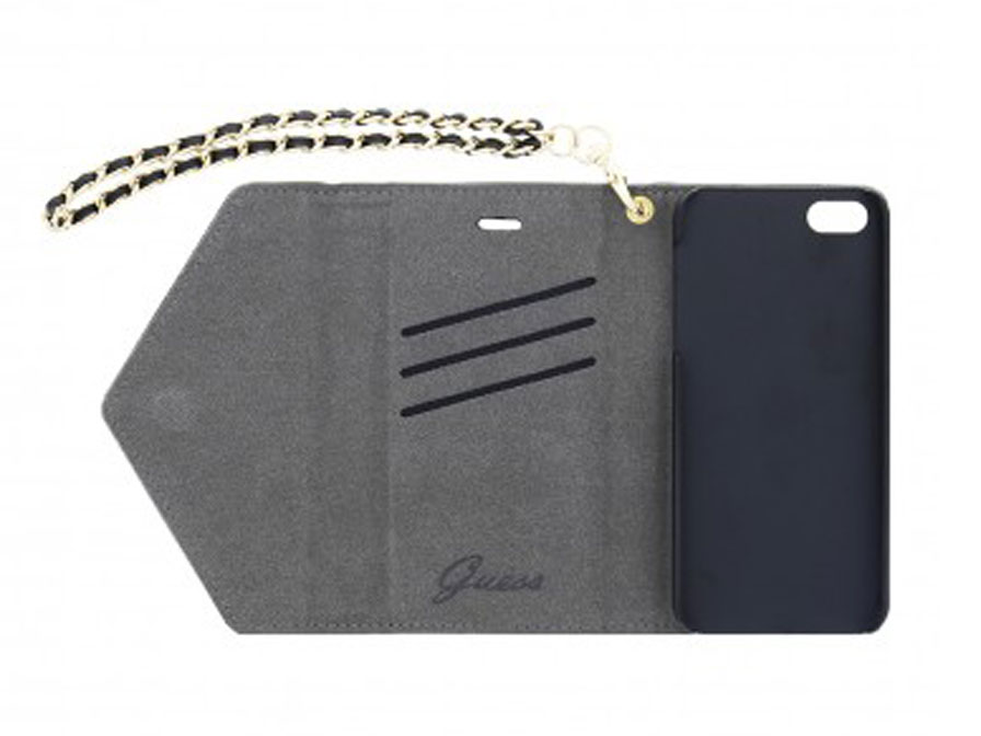 De Guess Studded Clutch uit de originele collectie Guess iPhone hoesjes is speciaal voor de iPhone 6/6S Plus ontworpen. Het hoesje, verkrijgbaar in zwart, crème wit en zilver, heeft een hip ontwerp met studs en het bekende driehoekige Guess logo. Het hoesje wordt geleverd met een matchend polsbandje.