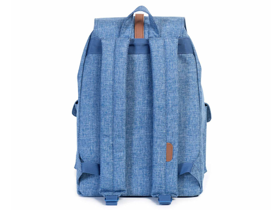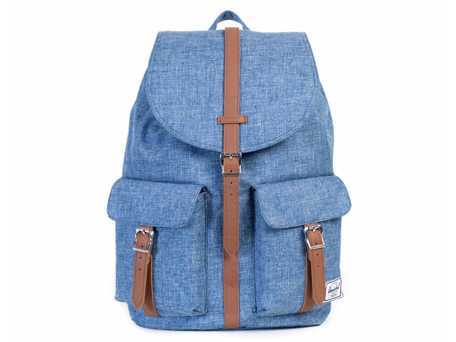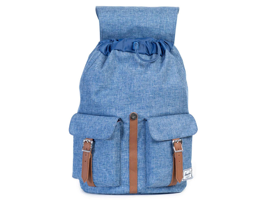 De Herschel Supply Co. Dawson rugzak is een fraaie tas die vintage looks combineert met hedendaags gebruiksgemak. De Herschel rugzak is gemaakt van lichtblauw nylon in combinatie met cognackleurige bandjes en zilveren gespen. Het gebruikte Crosshatch nylon geeft een denim-achtige look aan de rugzak. Van binnen heeft de tas de voor Herschel kenmerkende rood gestreepte voering.