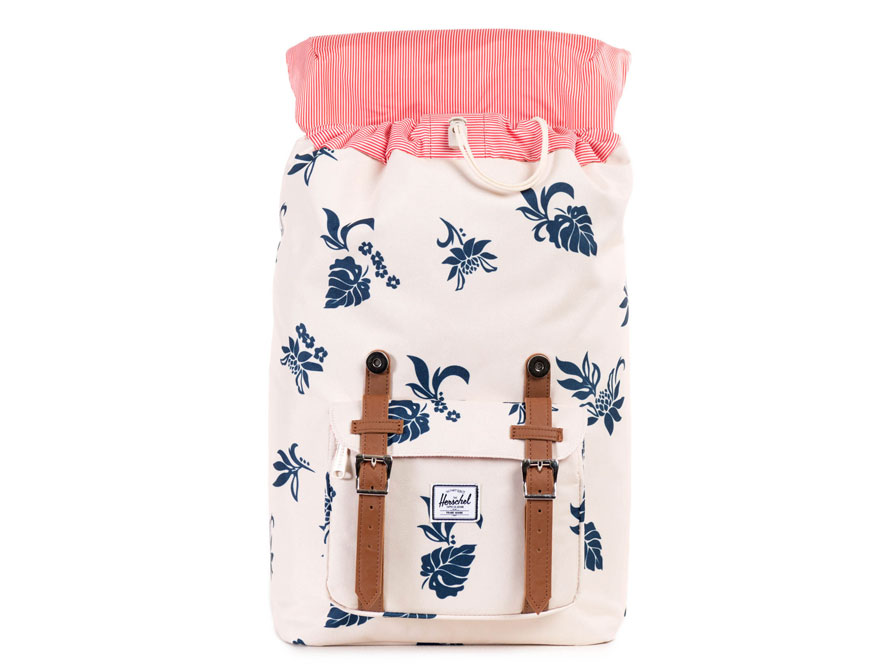 Deze limited edition Tropical Flora uitvoering van de Herschel Little America rugzak is gemaakt van wit nylon met een donkerblauwe tropische print en tankleurige riempjes. De rugzak heeft in het hoofdvak een speciale geïntegreerde 13" laptopsleeve, die extra verstevigd is en met zachte fleece bekleed is voor een optimale bescherming. Hierdoor is de rugzak bij uitstek geschikt om als laptoptas te gebruiken. Het hoofdcompartiment is verder ruim genoeg om alle dagelijkse benodigdheden in te vervoeren. Kleinere spullen vinden een plek in het voorvak, en er is ook nog een met fleece bekleed mediavakje voor een smartphone.