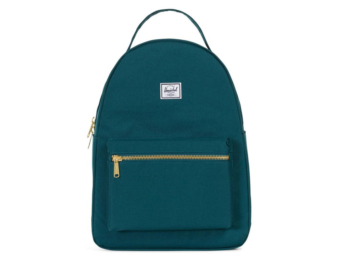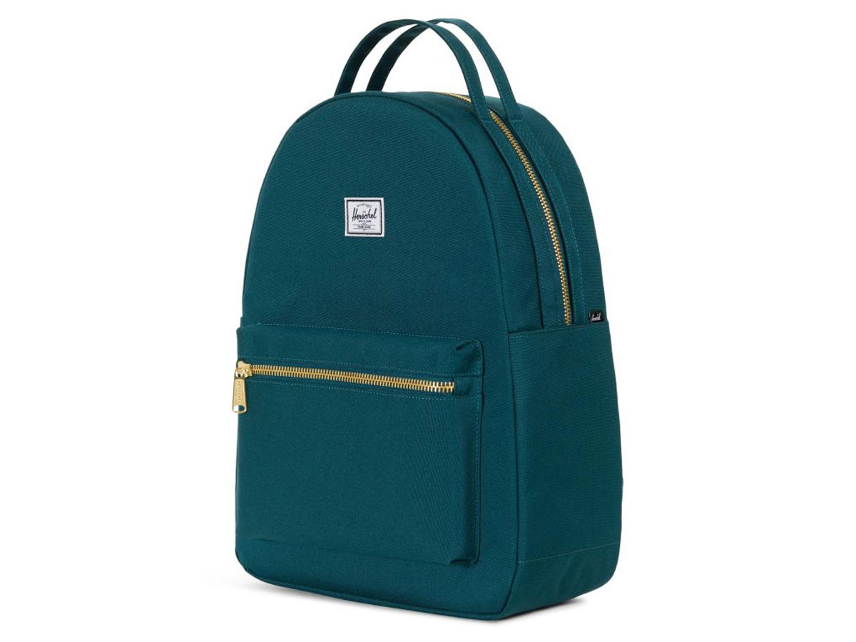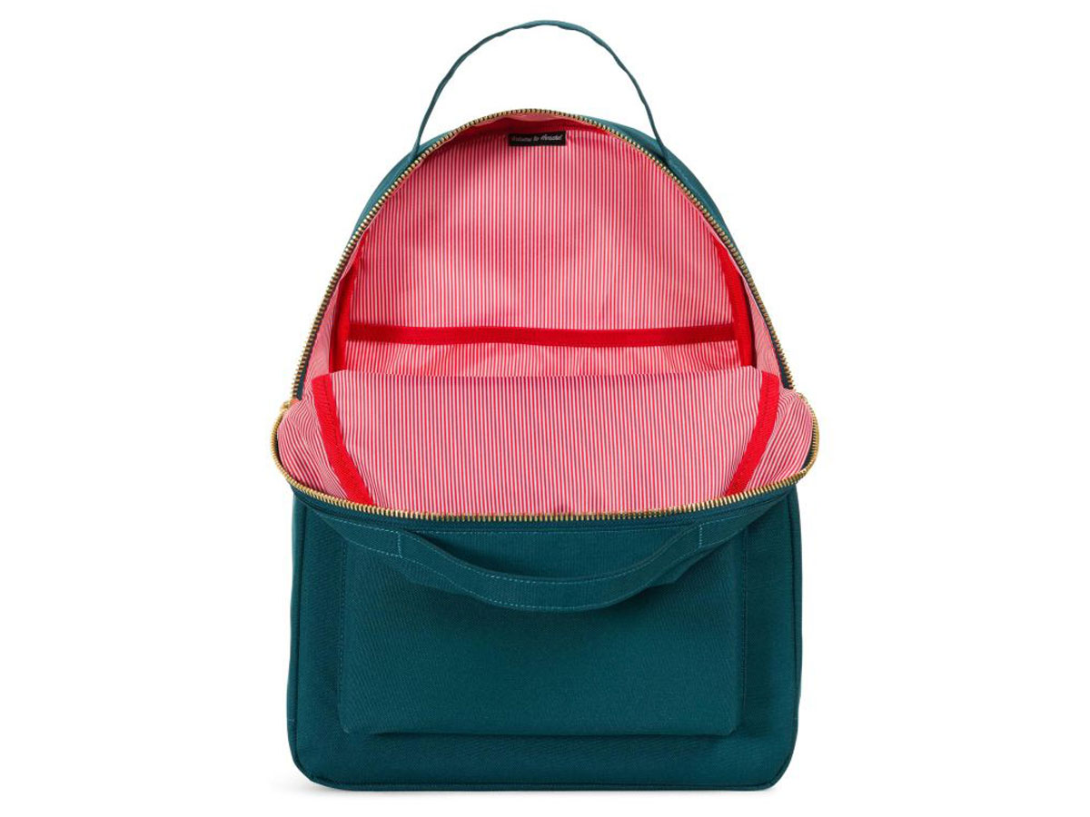 De Nova backpack wordt gekenmerkt door het dubbele handvat bovenop, de zichtbare metalen ritssluitingen en de kenmerkende rode Herschel voering. In deze Deep Teal uitvoering heeft de tas een prachtige diep blauwgroene kleur.