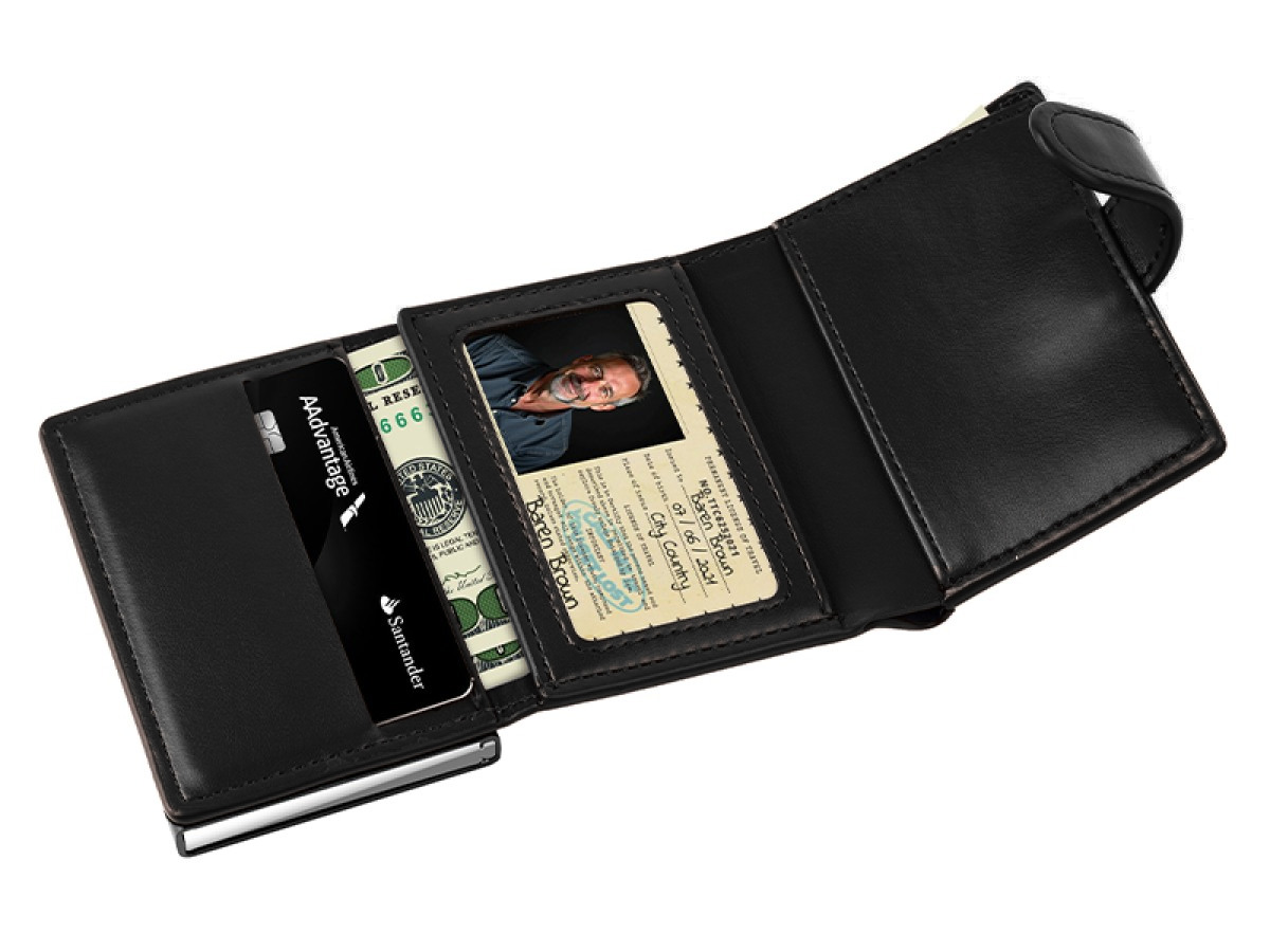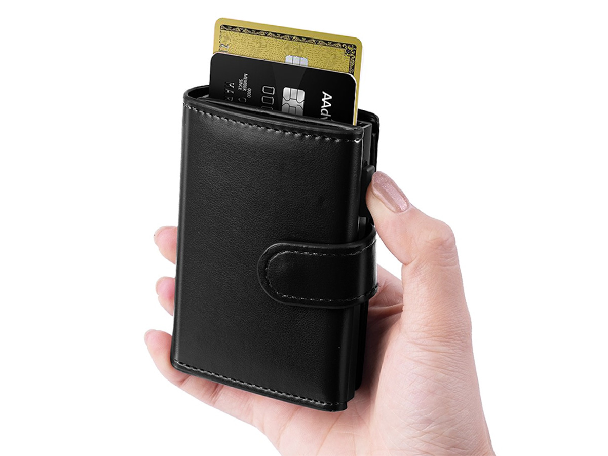 Wellicht de belangrijkste eigenschap van de Hoco Miniwallet is de aluminium pashouder waarin maximaal 4 kaarten opgeborgen kunnen worden. Met het schuifje aan de zijkant kunt u de kaarten eenvoudig omhoog laten komen, waarbij ze getrapt worden gepresenteerd zodat u eenvoudig de juiste pas kunt pakken.