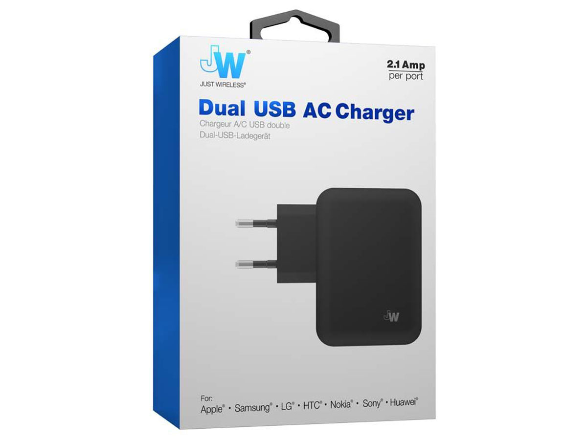 Deze Just Wireless Dual USB oplader is een echte krachtpatser. De oplaadstekker beschikt over 2 USB aansluitingen die tegelijkertijd elk 2.1A output kunnen leveren. Hierdoor laadt u eenvoudig twee smartphones of zelfs twee tablets tegelijkertijd snel bij.