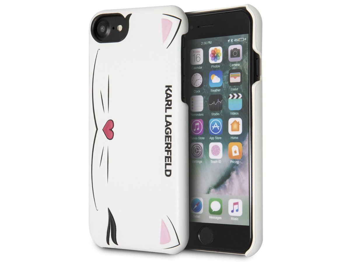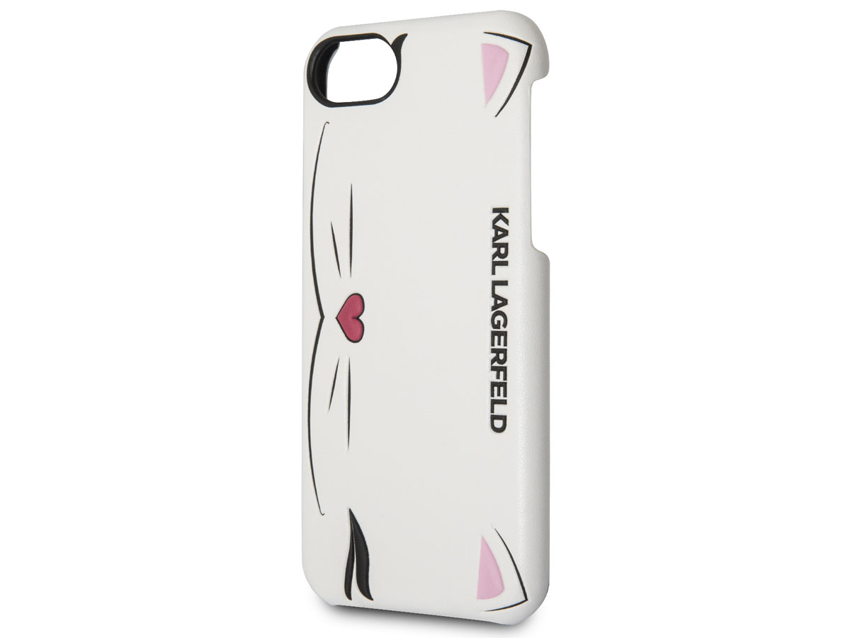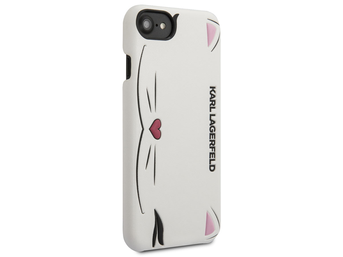 Dit originele Karl Lagerfeld iPhone hoesje is speciaal ontworpen om perfect om zowel de iPhone 8 als de iPhone 7 en iPhone 6/6s te passen. De case is bekleed met witte kunstleer, waar Karl's schattige Choupette je een vette knipoog geeft!
