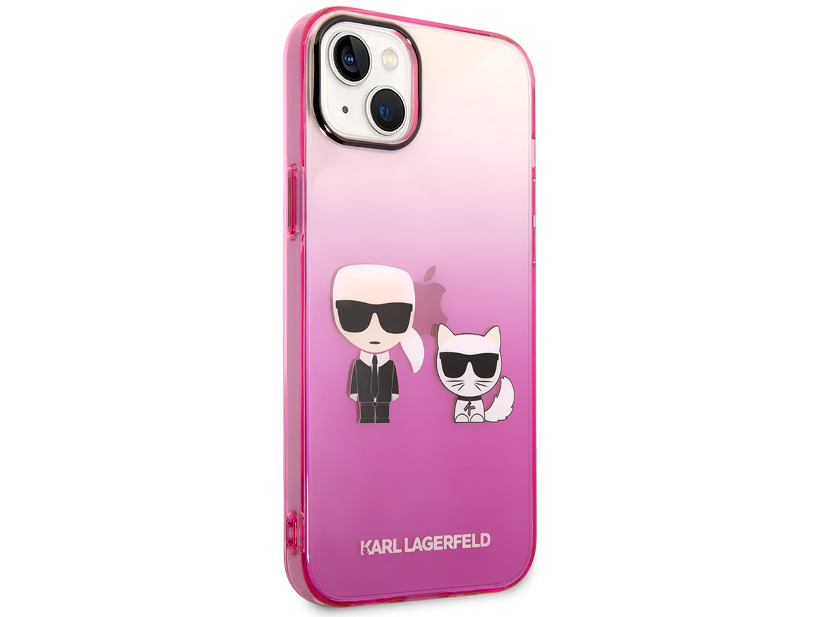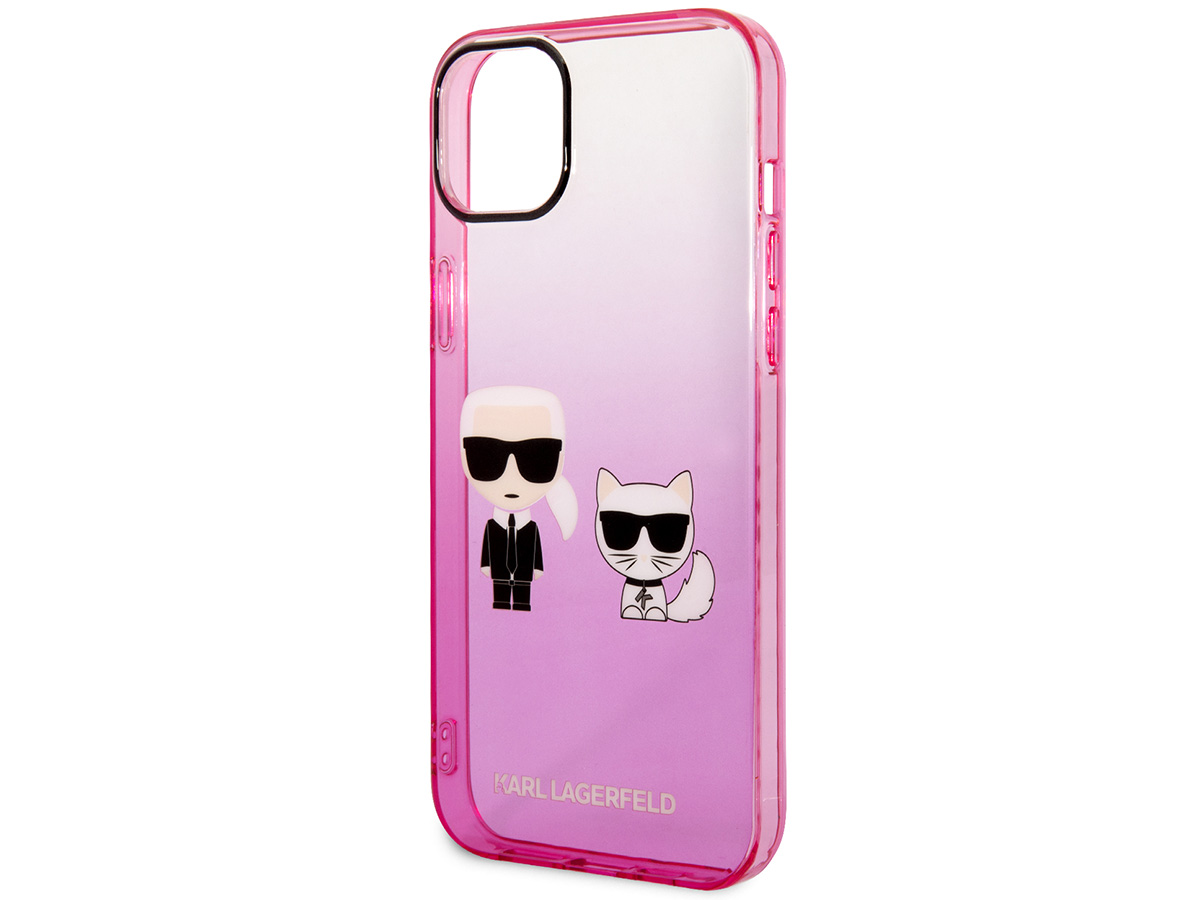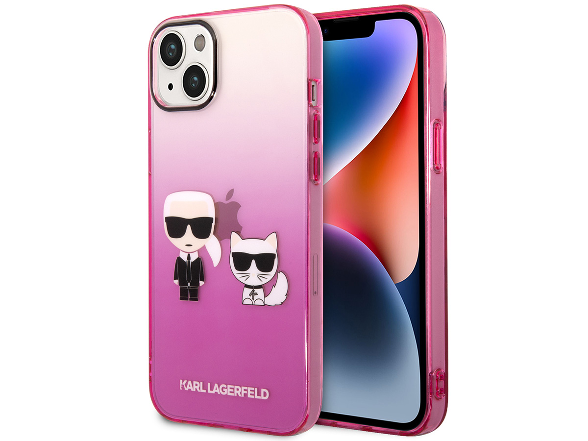 Dit originele Karl Lagerfeld iPhone hoesje voor de iPhone 14 komt uit de Ikonik collectie. De case is uitgevoerd in een transparant roze kleurverloop en wordt gesierd door het Ikonik duo: Karl zelf samen met zijn geliefde Choupette.