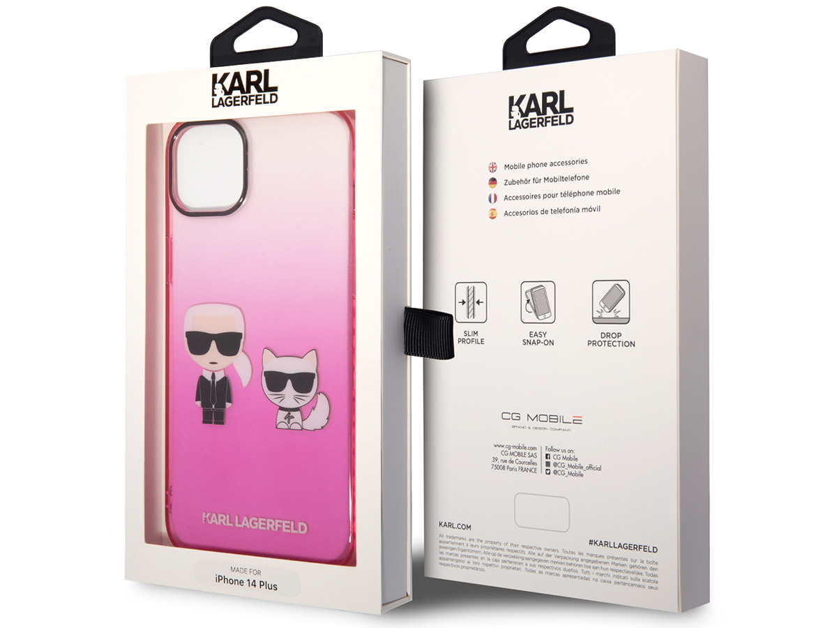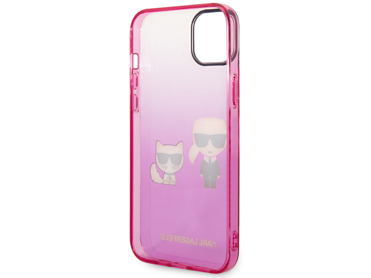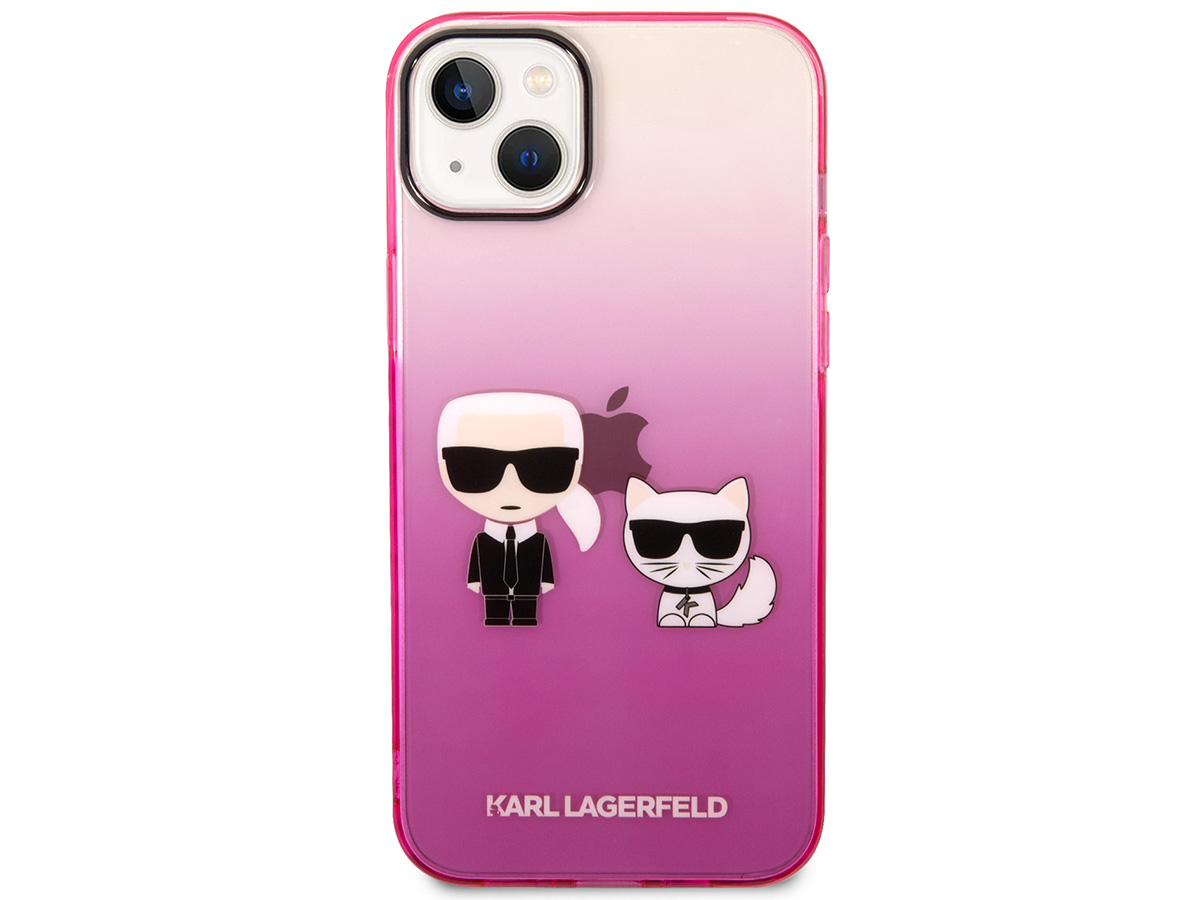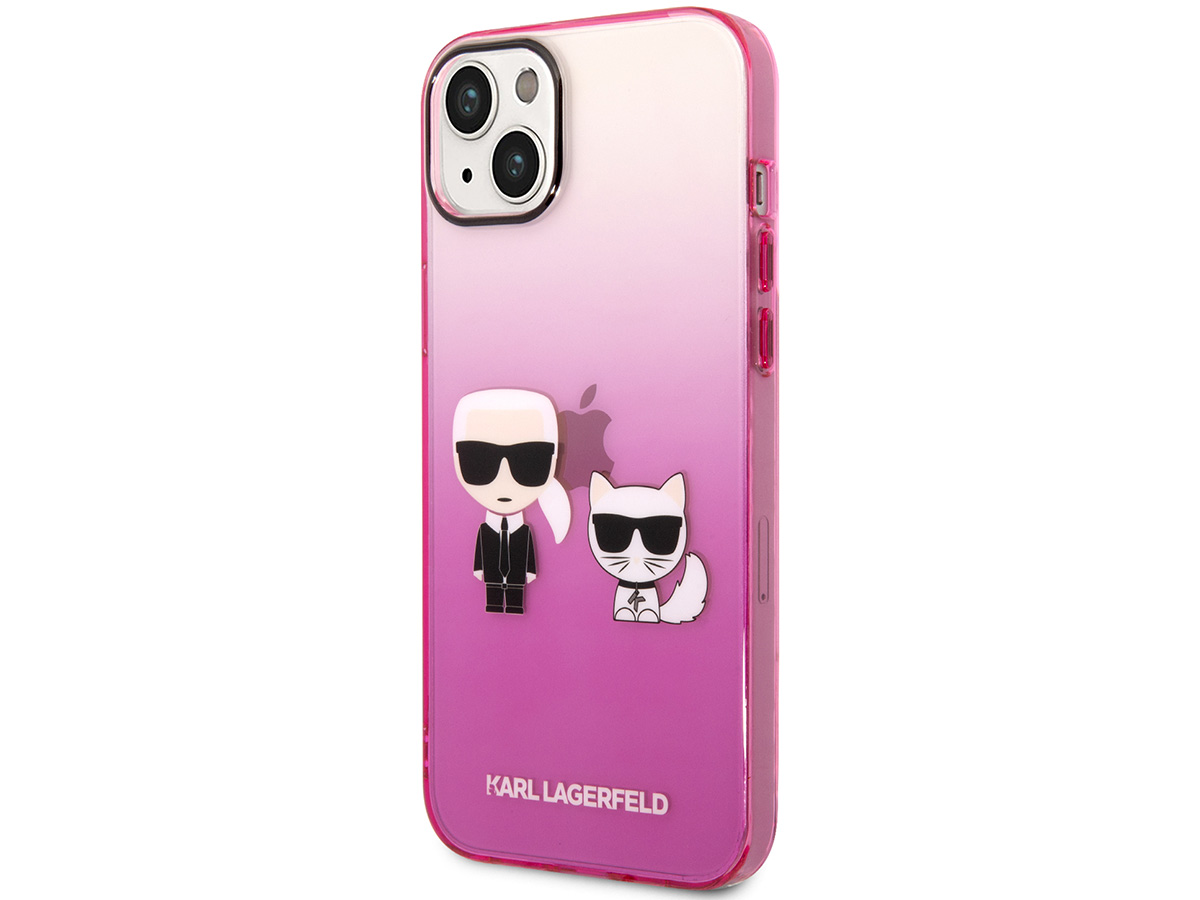 Dit originele Karl Lagerfeld iPhone hoesje voor de iPhone 14 komt uit de Ikonik collectie. De case is uitgevoerd in een transparant roze kleurverloop en wordt gesierd door het Ikonik duo: Karl zelf samen met zijn geliefde Choupette.